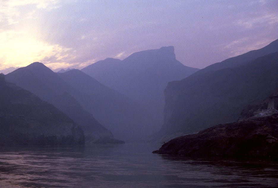 This afternoon we reached the third gorge, Xiling Gorge. I disagree with the guidebook – this IS the most spectacular of the Three Gorges, at least at its beginning. The gorge looks like a cross between the Swiss Alps without snow and the Mediterranean coastline, with its little villages set against steeply cliffed backdrops. Villages seem to be established in inexplicably poor locations, such as impossibly steep land, but (1) they are near the Yangtze for transport, (2) they have at least a little area of soil, (3) they now have electricity, and (4) the fogs and mists are frequent enough to provide constant moisture for their crops.