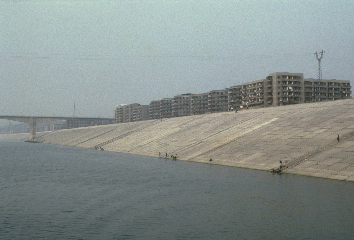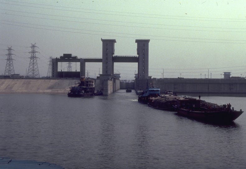 At some stage this afternoon – I’m not sure precisely where – we passed through the site of the proposed Three Gorges Dam, which will apparently be the world’s largest dam when (and I guess IF) it is built. By late afternoon we approached a smaller (through still huge) dam which is still under construction, the Gezhouba Dam at Yichang. At Gezhouba we had to pass through a lock, a process that took a couple of hours. While passing through the lock, a high school English teacher was watching us with his class. We conversed in shouts – his English was very good and it was evident that his ability to converse with us so easily in English raised his esteem considerably in the eyes of his students.
