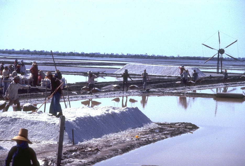 The first areas we went to south-west of Bangkok were very flat and uninteresting at first (although some of my seasoned fellow passengers informed me that they were still better than Hong Kong’s New Territories). Because these areas were neat the coast, they were salt-affected and therefore not very productive. In fact, about 80 kilometres from Bangkok, we came across a large salt evaporation area where ocean water is pumped into fields by windmills, left to evaporate, and then mined using very labour intensive methods. They extended for about 15 kilometres on both sides of the road. We drove as far as the mouth of the Mae Klong (which means Mother Canal) and then turned inland.