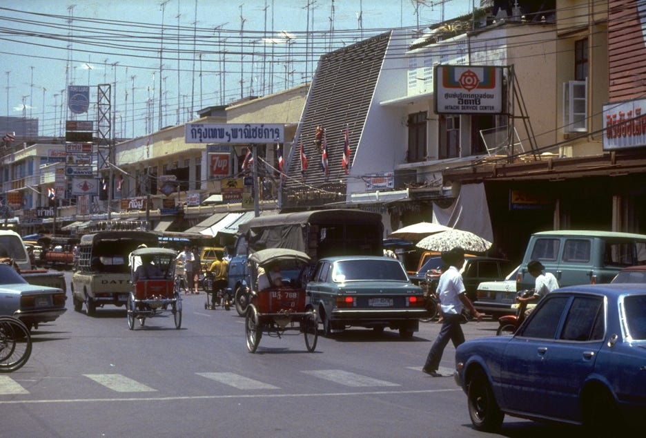 Buildings in Bangkok look as though they have been built well at first, and then just used with no maintenance at all. Ditto the cars, which are mostly Japanese although it can be seen that the wealthy drive Mercedes and Volvos. There are also lots of little three-wheeled Daihatsu taxis as well, known as ‘tuk-tuks’ because of the sound of their engines. Out of Bangkok, however, almost all the vehicles are trucks and buses.