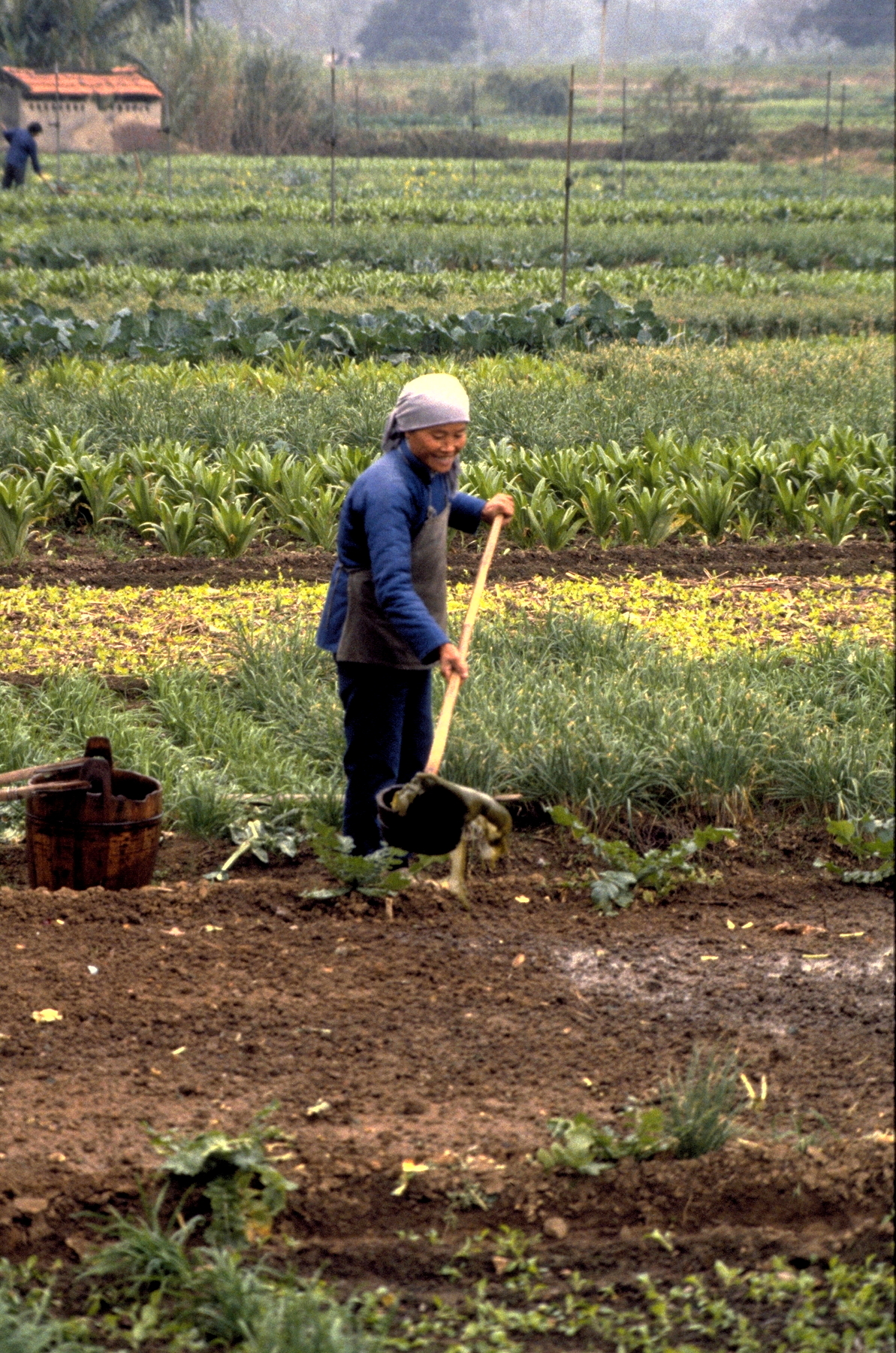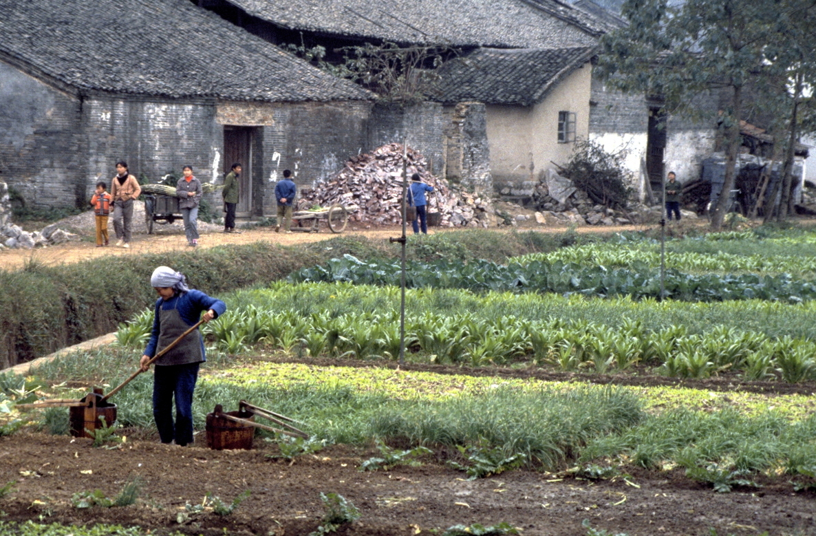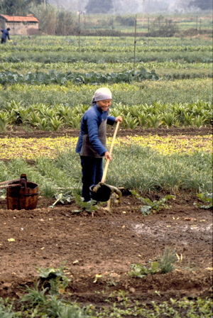 Our next stop was a small jade and wood carving factory run by the Guilin City authorities, but which for reasons of shortage of space, was located on a rural commune to the south-east of the city. The workers in the factory come not from the commune but rode by bicycle each day from the city. At first, we thought we were on the tourist route (which we were, in effect), until we reached a painting workshop. Our students’ Chinese encouraged the workers to let them have a try at calligraphy, which they did with great enthusiasm. We wound up converting a normal 15-minutes tourist stop into a stay of well over an hour as all the boys tried their calligraphy, and our Chinese Language teacher reciprocated by painting a metre long thankyou note in brushwork. Before leaving, we also had time to look around the vegetable fields, where women were pouring matured nightsoil from buckets onto the crops as fertilizer. The boys also had their first close look at traditional shoulder poles and that curious piece of ingenious Chinese machinery, the walking tractor.