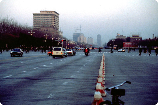 After checking into our hotel, the Hua Du Fandian on the north-east corner of the city, we set out at a little after 4:00pm for a half hour look around Tian An Men Square. Sunset was at about 4:20pm, so with the sightseeing lasting from 4:30pm to 5:00pm, it was largely done in twilight. Nonetheless, we were able to get some feeling for the grandeur of Beijing from the visit. The square can hold over a million people (it did so for Mao’s funeral in 1976), and it contains many of Beijing’s famous landmarks such as the Great Hall of the People, the Museum of Revolutionary History, the Chairman Mao Memorial Hall, the Monument to the People’s Revolutionary Martyrs, the several hundred metres wide Chang’an Avenue (Avenue of Everlasting Peace), Qianmen (the large stone gate which marked the southern entrance into the old imperial city) and the Gate of Heavenly Peace from which Mao proclaimed the People’s Republic in 1949.