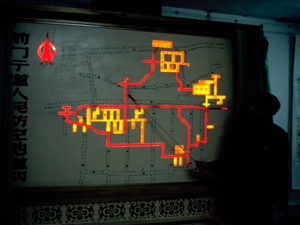 Getting there was something of an exercise in frustration, however. We waited half an hour for a taxi (or, really, a taxi driver, since there were several score of taxis parked outside our hotel). It then took one and a quarter hours to find the entrance, which is about six kilometres from the hotel, even though I had the address and directions written out in Chinese by our local guide. The taxi driver, who spoke no English but made me realise how many strategic Chinese phrases I knew, stopped six times to ask directions. I’m glad the Soviets didn’t attack Beijing before his drive with us! We finally found the main entrance and command centre behind an ordinary shop front down a narrow little hutong (or laneway) off Qianmen Street.
