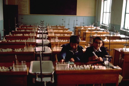 After a welcoming reception, the students were split into two groups. One group visited a class of Chinese language (where they became engaged in informal conversations) while the others joined an English class, taken by the enthusiastic and very competent Mr Liang Shu-chang. The English class was studying a passage about Albert Einstein (even language lessons in China teach political lessons, this one being related to Science and Technology, one of China’s Four Modernisations priorities, plus some comments on the persecution of Einstein due to his Jewish origins). A substantial part of the lesson involved reading paragraphs aloud, and the Chinese students burst into applause at our students’ “native” accents when it came to their turns.