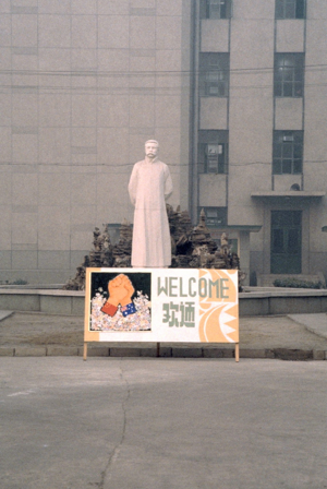 Our day in Tangshan was as memorable as our reception the night before. The morning was very foggy as we drove up to Tangshan No.1 Middle School, my teaching colleagues in the chauffer driven Datsun from the Ministry, and the rest of us in a very cosy Mitsubishi minibus. The school had prepared a special welcoming banner for us, all the VIPs from the previous evening were present again to welcome us together with a large contingent of students, and two of the Tangshan students videotaped our arrival and activities.