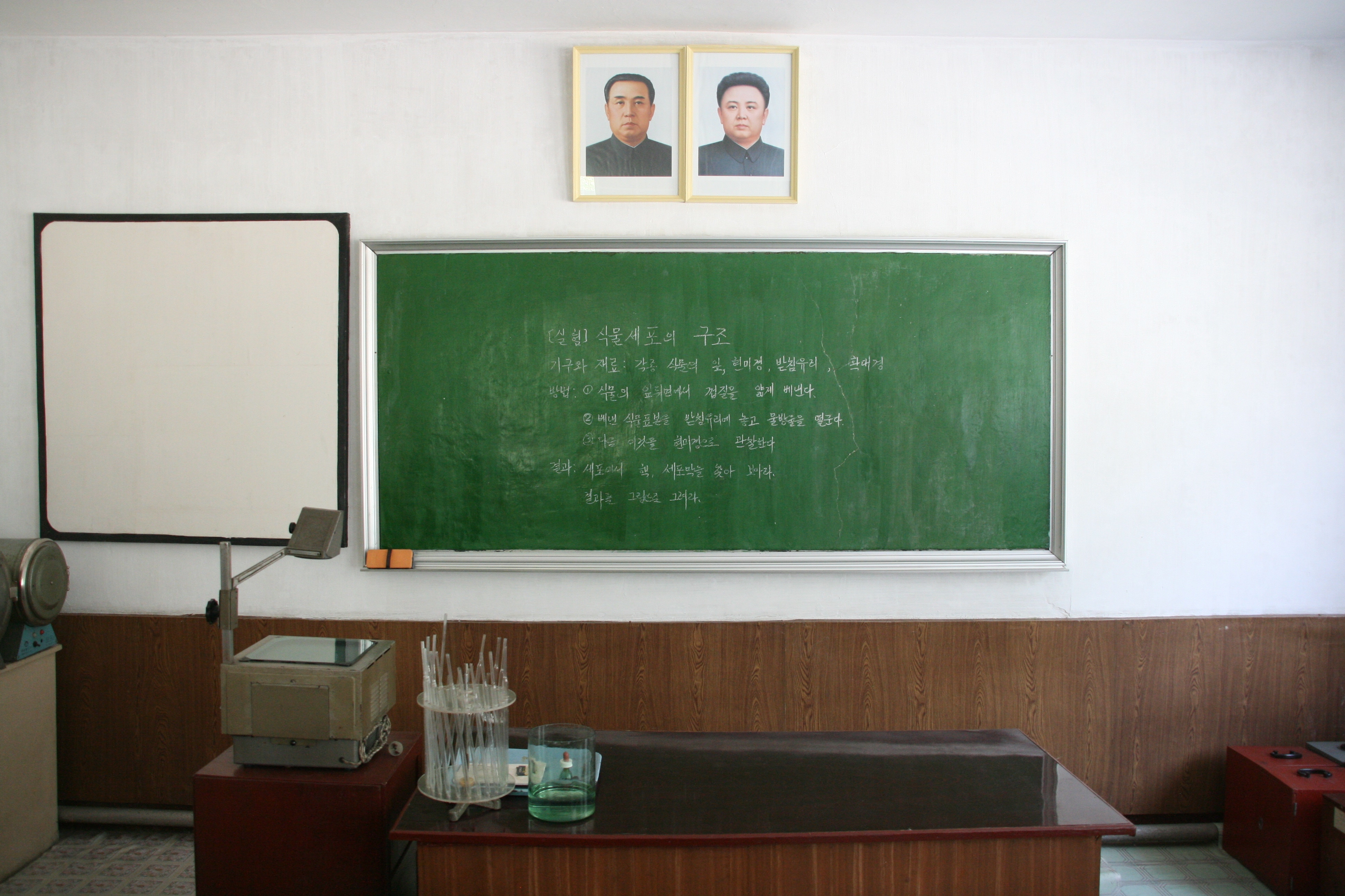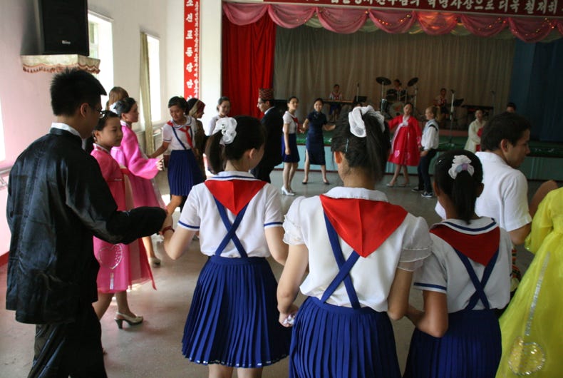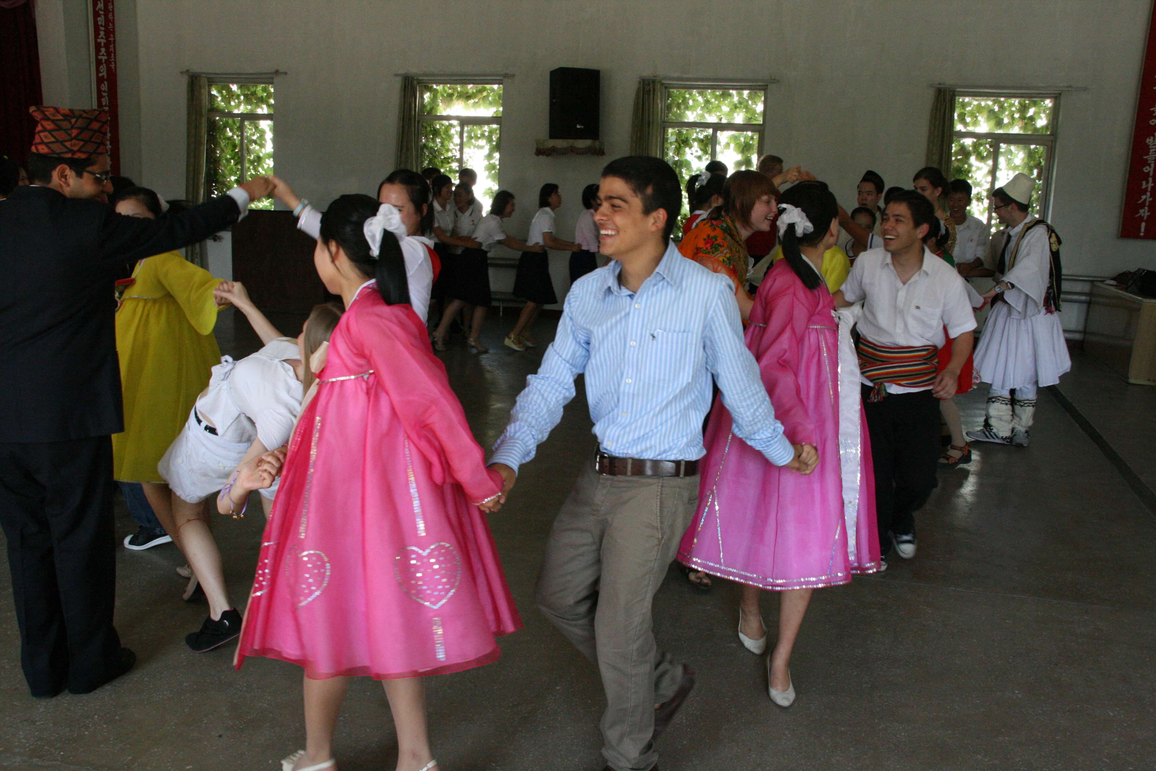 After the lesson, we moved to the school’s auditorium for a concert. Students from June 9th Secondary School (almost all girls) performed some beautiful songs glorifying the nations leadership, after which they invited our students to join them in a reunification dance. To thank our hosts, our students then provided a series of performances for the local students - a South Asian dance, a demonstration of tae kwon-do, a performance of Abba’s ‘Mama Mia’, Chinese rope skipping, a Latin American dance, an Albanian communist song, a Japanese fishing dance, a French song, and a Chinese fan dance. Our students’ performances were excellent given the severe difficulties faced in sound quality, and the setting was great - the school’s auditorium stage, all under the big red and white Korean lettering that translated as “Arm ourselves with the revolutionary ideas of the President Kim Il Sung!”.