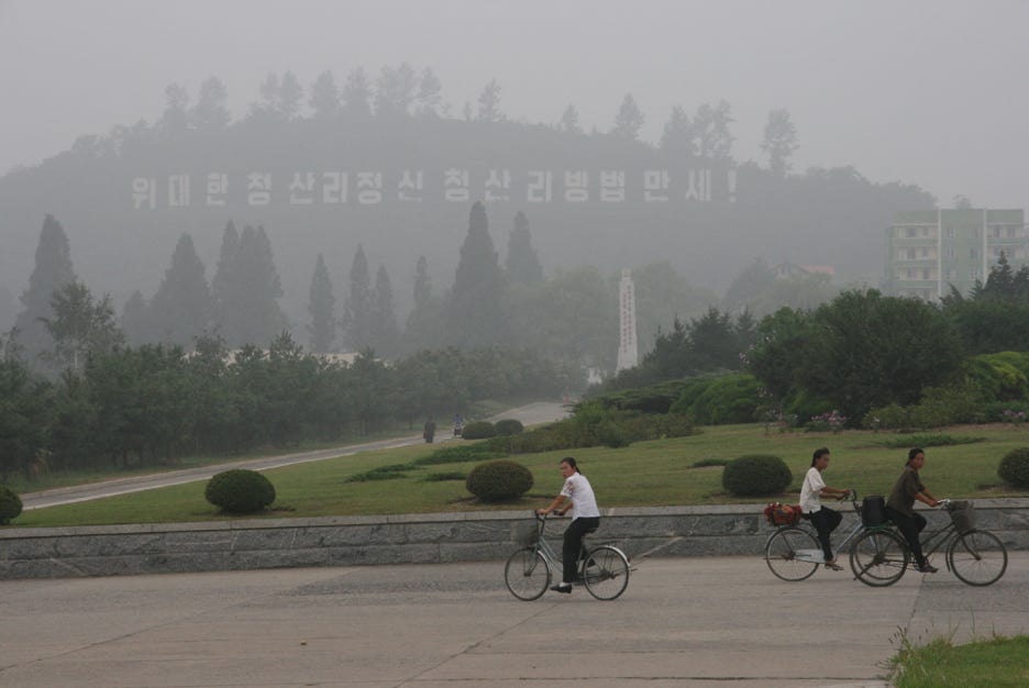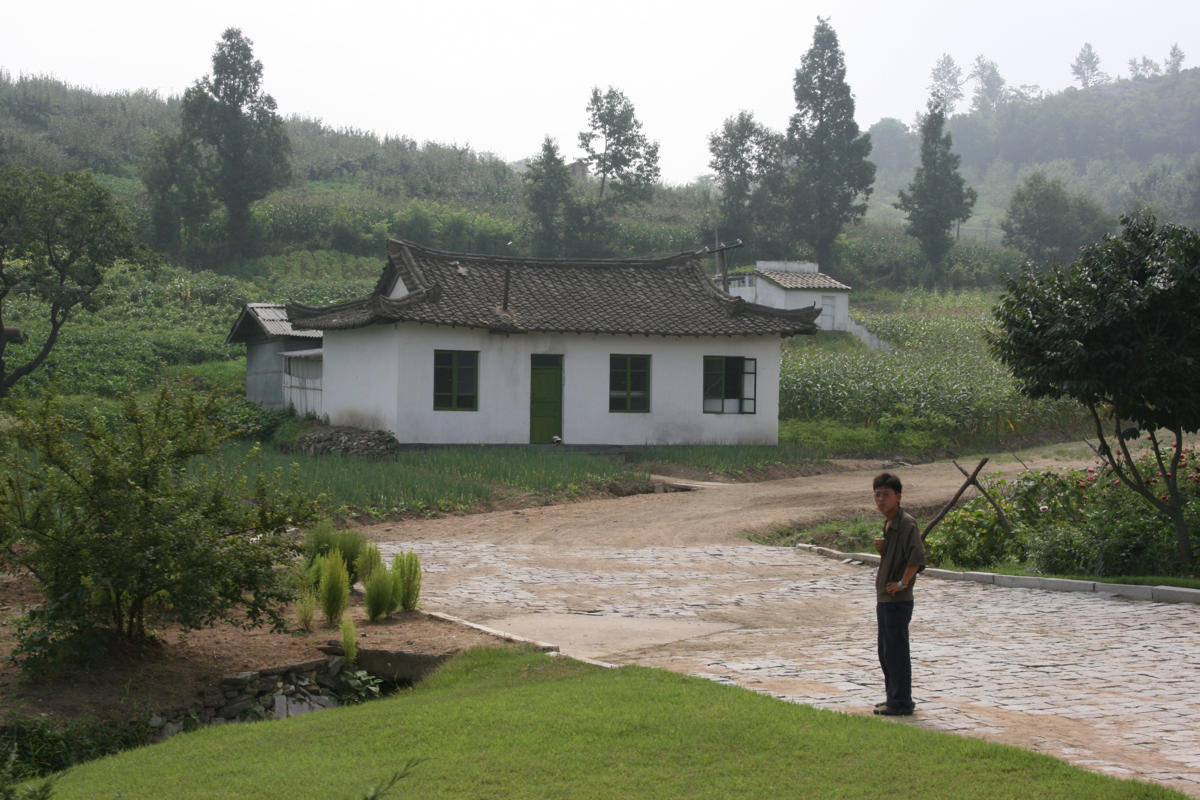 We left our accommodation compound at 7:30 am after long negotiations about a bottle of water purchased by one of the students. Our first stop was about half way back to Pyongyang, the Chonsamri Co-operative farm.