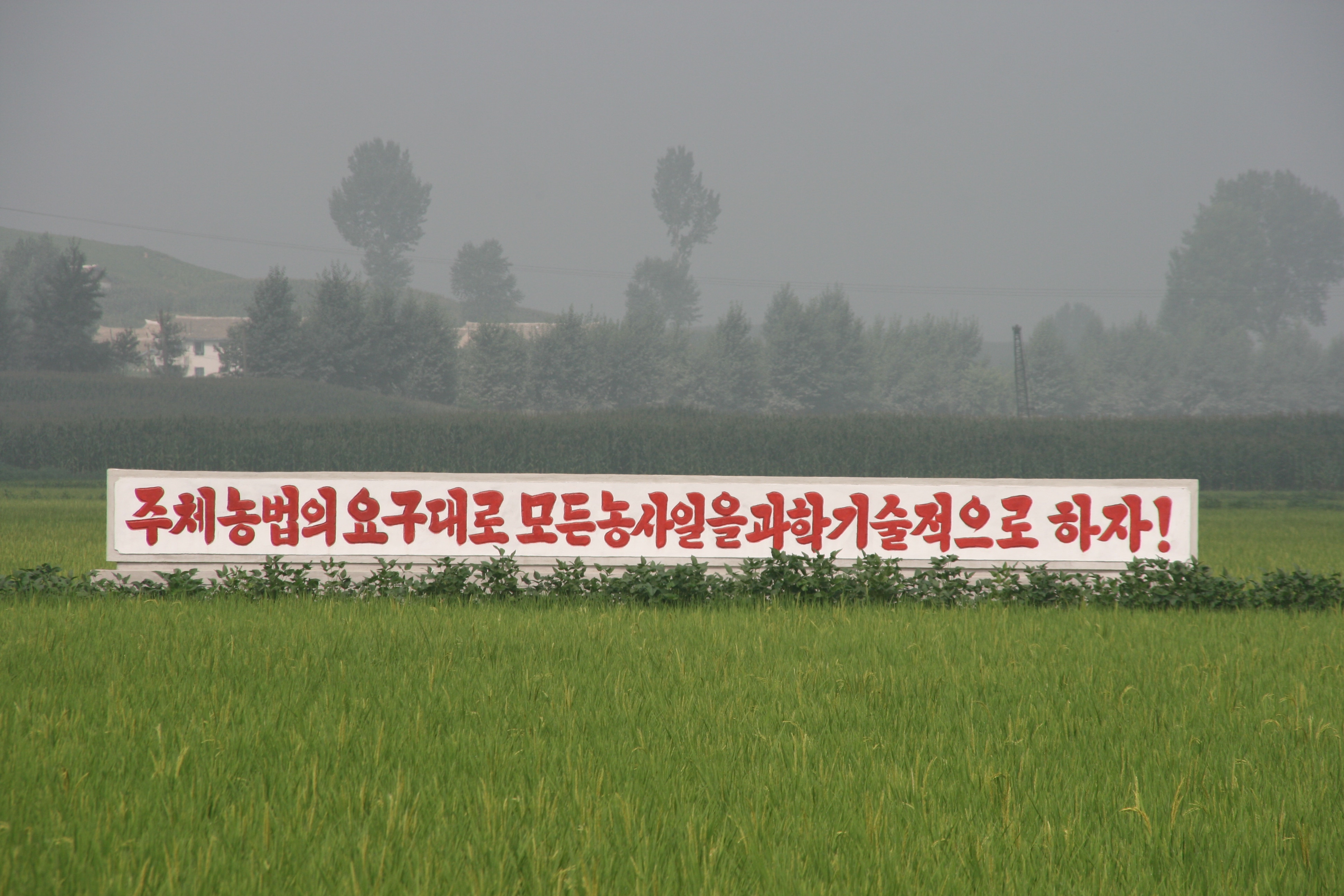 After looking through the farm’s museum, all nine rooms of which are largely devoted to Kim Il Sung’s visits and his brilliant on-the-spot guidance, we ventured out to the fields. The fields certainly looked productive and well maintained (even including kerbing and guttering on some of the concreted farm roads), which effective interculture comprising maize, beans and rice interspersed between each other. Our main destination was a monument in a rice padi marking the point where Kim Il Sung helped with transplanting rice on one of his visits. A nearby sign adorned the field with a fairly common slogan in North Korea’s rural areas: “Let’s do cropping using the juche method”, which as all North Korean farmers know, means using “the right crop, in the right season, on the right land”.