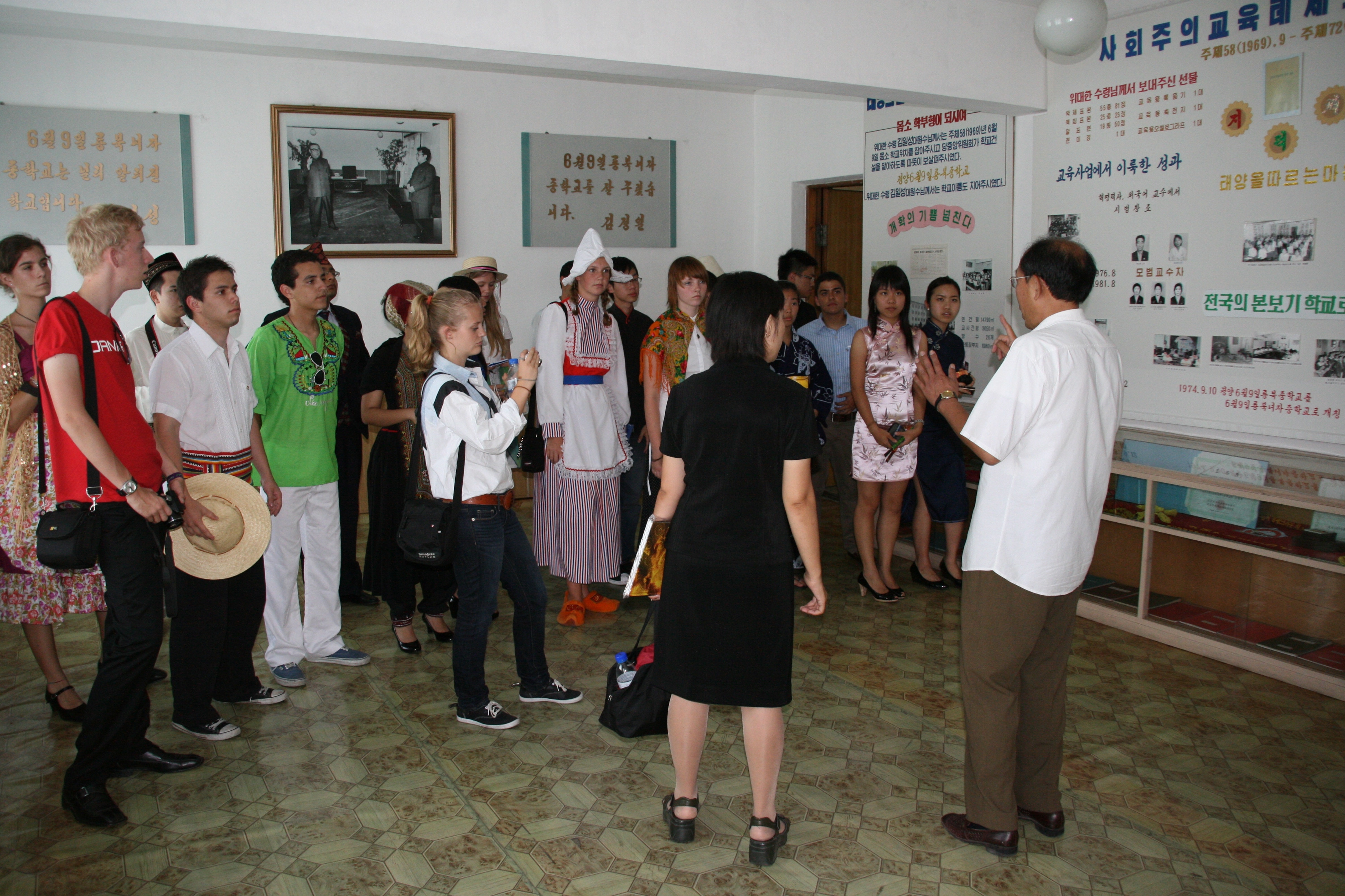 The students used the lunch break to change into their national dress for the next visit, June 9th Secondary School. The school was visited by Kim Il Sung on June 9th (in which year I am not sure), and the school was re-named in honour of that event. We were welcomed personally by the Principal and some students, who had come to the campus during their August holidays specifically to meet and greet us.