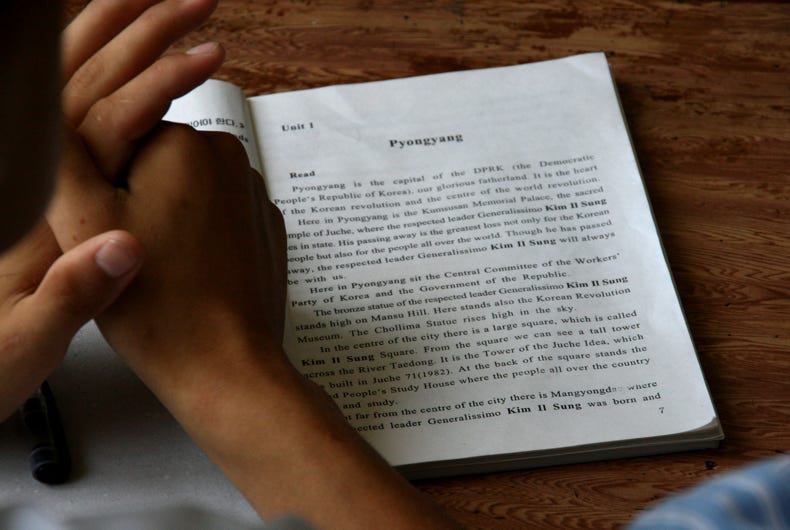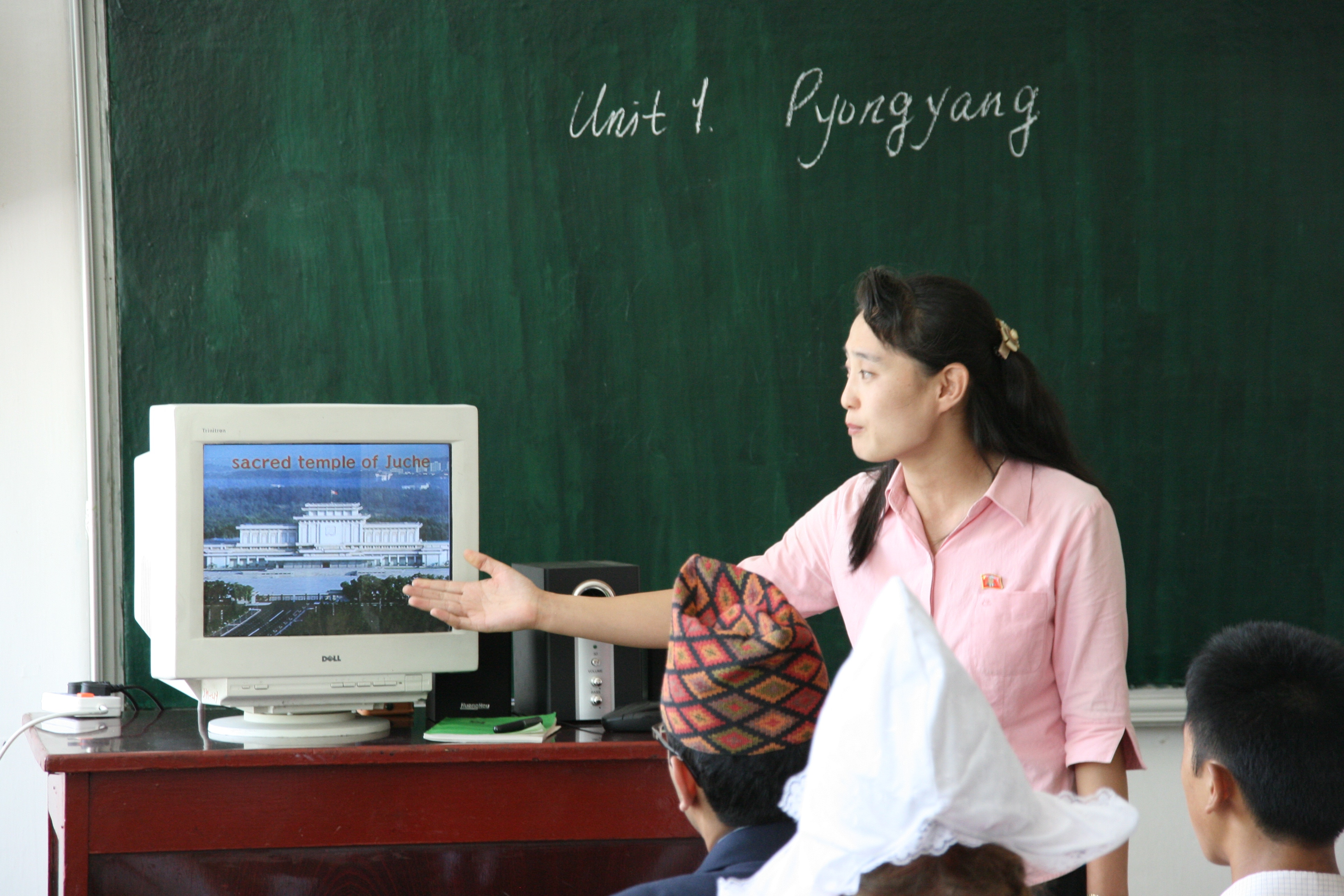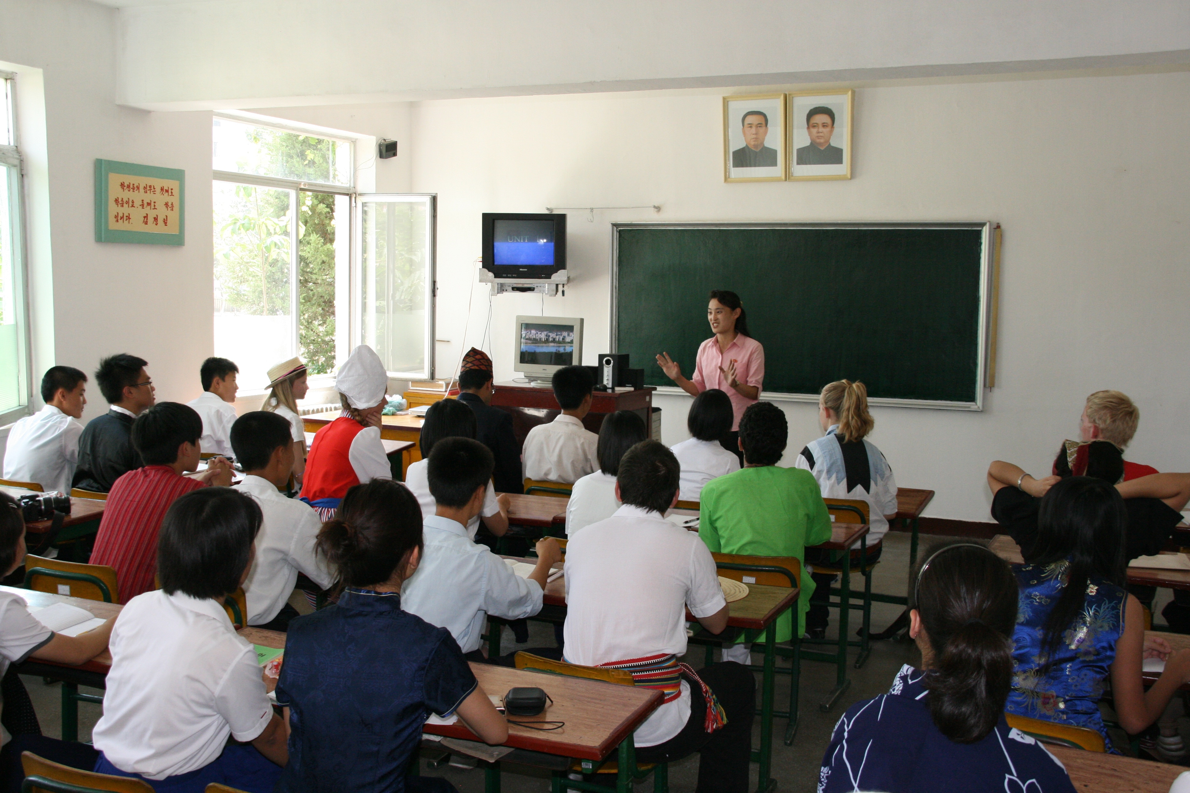 The focus of the lesson was “Pyongyang”, which naturally led the students into useful vocabulary such as ‘temple of juche’ to describe Kim Il Sung’s mausoleum, ‘pass away’ (rather than ‘die’) to describe what happened to Kim Il Sung, and especially useful for everyday conversation, ‘lie in state’ to describe the President’s current condition. As with previous visits, the free conversation was especially valuable, because it gave our students to speak on an unscripted basis with young North Koreans of their own age. They discussed many issues, such as homes, family, sports, interests, food and music, and many of the students exchanged addresses to maintain contact in the future. Unlike last year, I didn’t have the chance to be greeted by the stock sentence “hello, my name is X. I am a citizen of the Democratic People’s Republic of Korea and therefore I envy nothing in the world”.