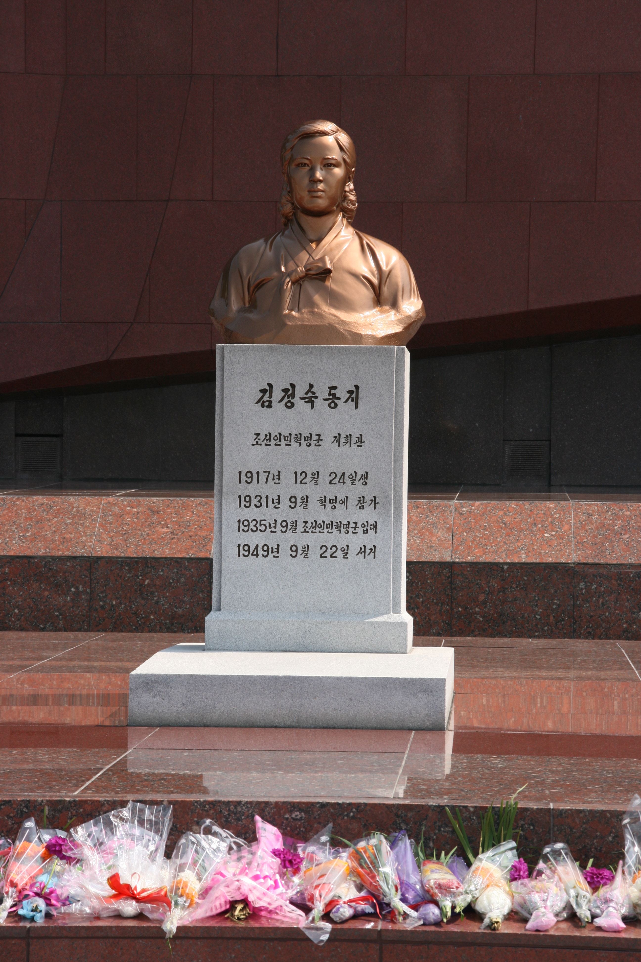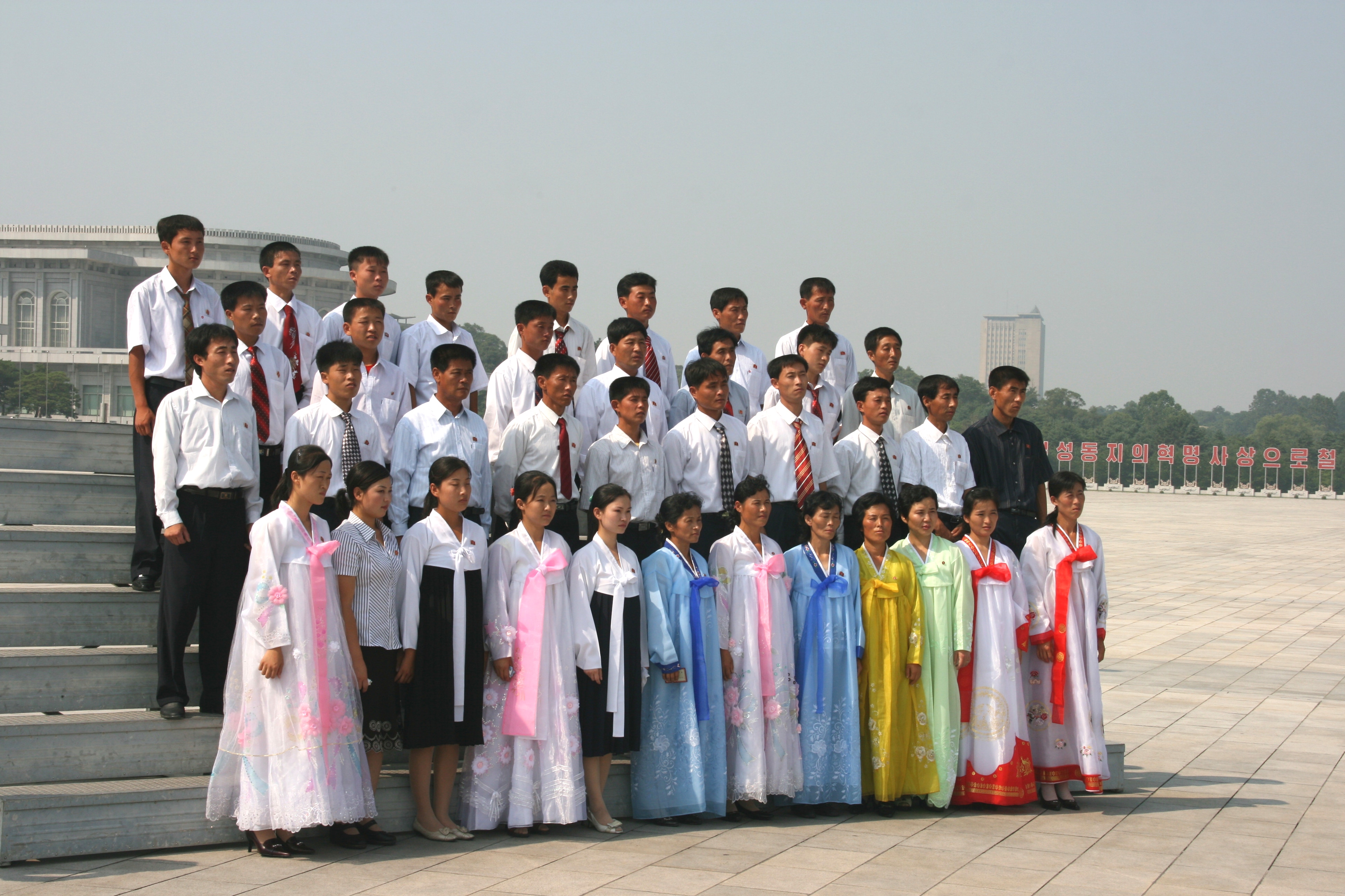 After the deeply moving mausoleum visit (the most frequent comment from my students being “Wow!”), we took the short drive to the Revolutionary Martyrs’ Cemetery. Built on a hill overlooking the city of Pyongyang, this is the final resting place of many heroic soldiers and fighters against the Japanese and/or the US. Pride of place at the top of the hill, just below a huge red granite flag, was Kim Jong Suk, the wife of Kim Il Sung and the mother of the present leader, Kim Jong Il. Each grave was marked by a stone tablet topped with a bronze bust of the person’s head and shoulders, reconstructed as far as possible from old photographs or, where this was not possible, from descriptions from comrades or family members. The busts all faced towards the city of Pyongyang at the foot of the hill, and were arranged in such a way that no bust obscured the view of those behind it. The overall effect was very impressive - dignified, sensitive and respectful.