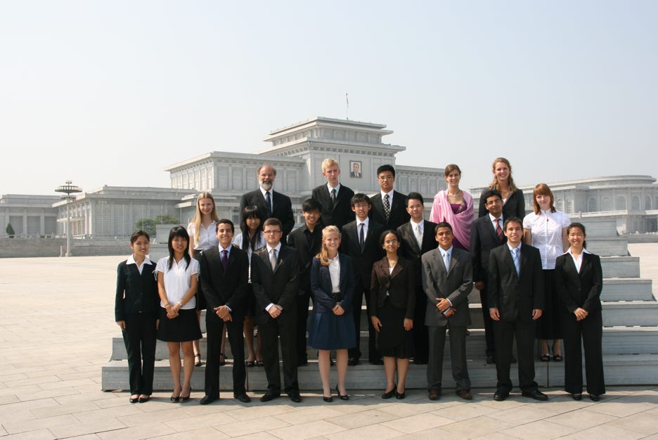 Finally, we passed through some rooms displaying Kim Il Sung’s railway carriage and his last car (a black Mercedes-Benz) before walking through a room where people (but not us this time) are invited to write their reflections and tributes in special books, and then emerging into an outdoors courtyard where group photos could be taken. For most of my students, it was the first time they had met a currently serving President.