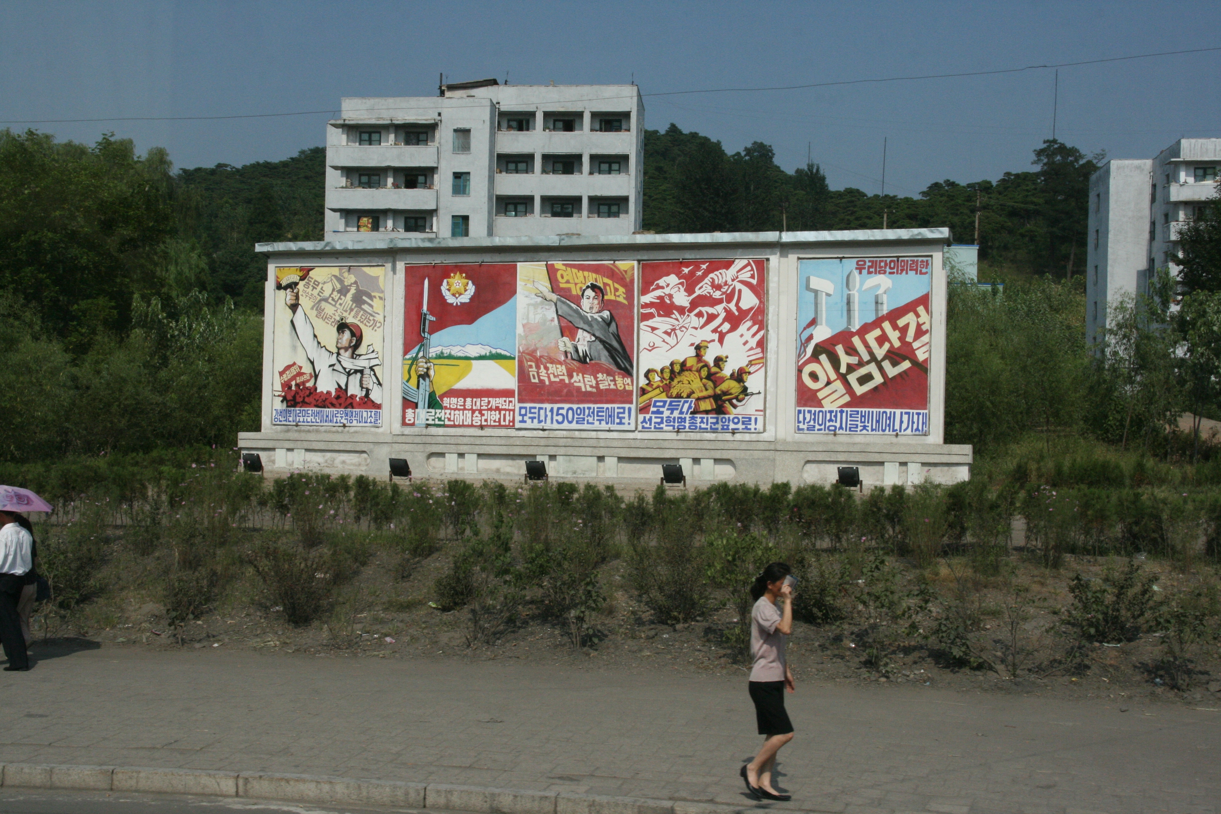It was interesting to note that even on a bush walk one is never away from political messages, with many large rocks being engraved with slogans about national reunification, and a display area of the wild plants that soldiers had to eat to avoid starvation during the hard times of the anti- Japanese struggle. There was a trickle of water at the Sangwon Falls, and the area was very picturesque, featuring a beautiful pavilion overlooking the waterfall and the surrounding valley. Not may people can claim to have been on a hike in North Korea, and it did provide us with some much needed exercise.
