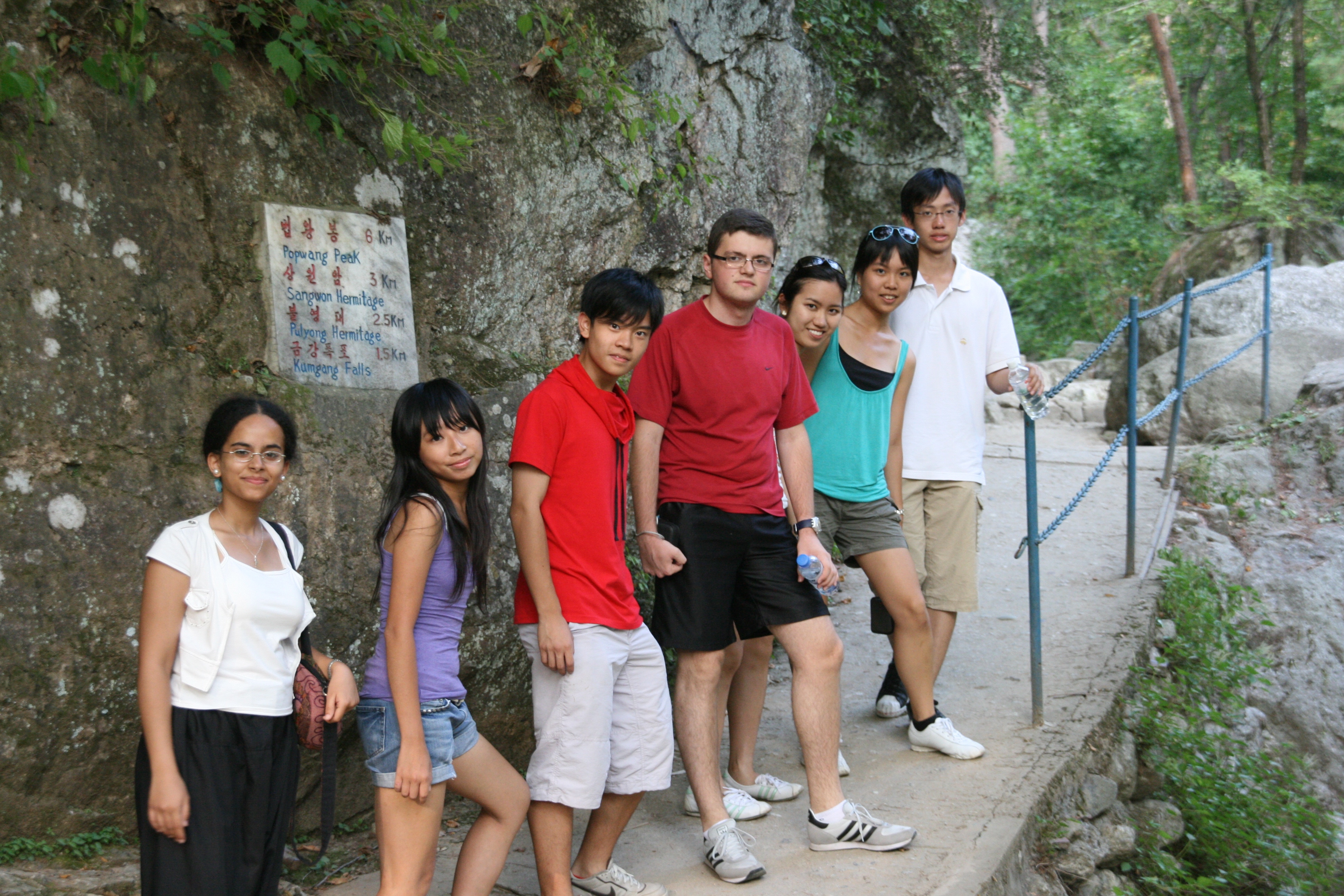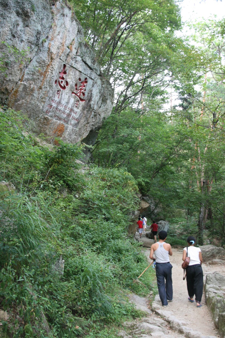 The drive was on an excellent, wide road that passed through pretty if unspectacular farming fields growing rice, corn and beans. We arrived at Mount Myohyang at about 5 pm, and after taking our things to the rooms of our hotel, we set off for a 6 kilometre hike up the mountain to a waterfall named Sangwon. Although we followed the course of a mountain stream, recent rainless conditions meant that several sections of the river were dry.