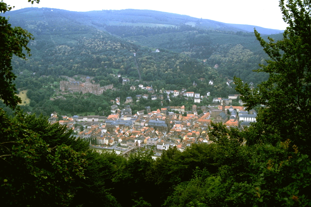 Because of the wet weather we went to various shops in the morning (and Di even found a Mothercare!), including buying some provisions for lunch.  We took our lunches up to a hill overlooking Heidelberg castle and sat on a seat under the trees to admire the view.  The views were wonderful, and it was a real pity that the rain was still falling and the atmosphere was heavy, grey, foggy and misty.