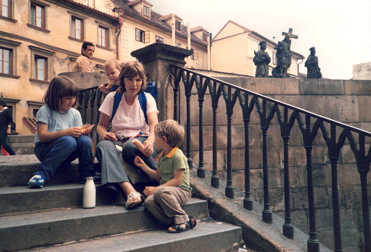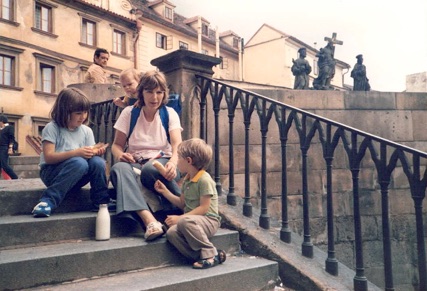 We began our walk at Charles Bridge (Karlův Most), which is one of Prague’s most beautiful landmarks. Built in the 14th century, Charles Bridge spans the Vltava River, joining the elevated western bank that houses Prague Castle (Hradčany) and St Vitus’ Cathedral (Chrám sv. Vita) with the flatter eastern bank that accommodates the main city centre that includes the Old Town (Staré Město) and the so-called (but still old) New Town (Nové Město). We climbed the tower at the western end of the bridge, which provided exquisite views of the castle, the cathedral, the narrow laneways of the “Lesser Side” (Malá Strana) around the foot of the hill, and expansive views across the river of the main city. Upon descending from the tower, we were all very hungry and thirsty, so we bought some food and sat down on the steps of the bridge to eat it.