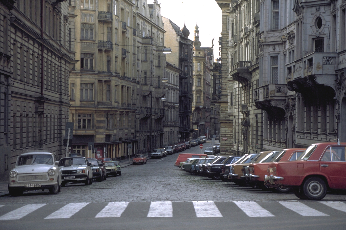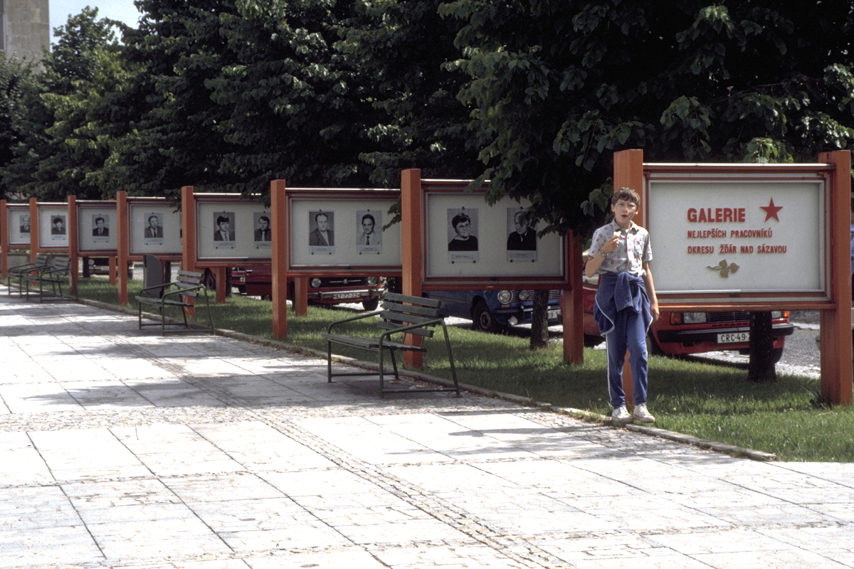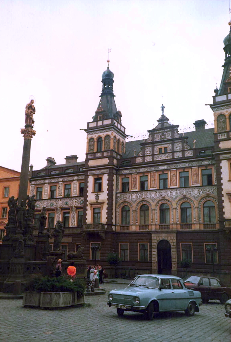 Pardubice had a lovely old medieval town centre, which even featured several pastel-coloured Škodas and a Lada decorated with white ribbons as wedding cars.  Rain started to fall as we left Pardubice and continued our drive through Chrudim, but it cleared by the time we reached Ždár nad Sázavou, a newer town where we stopped to have lunch and admire the open-air gallery of black-and-white photographs showing grim-faced model workers.