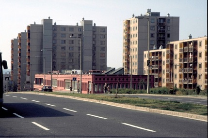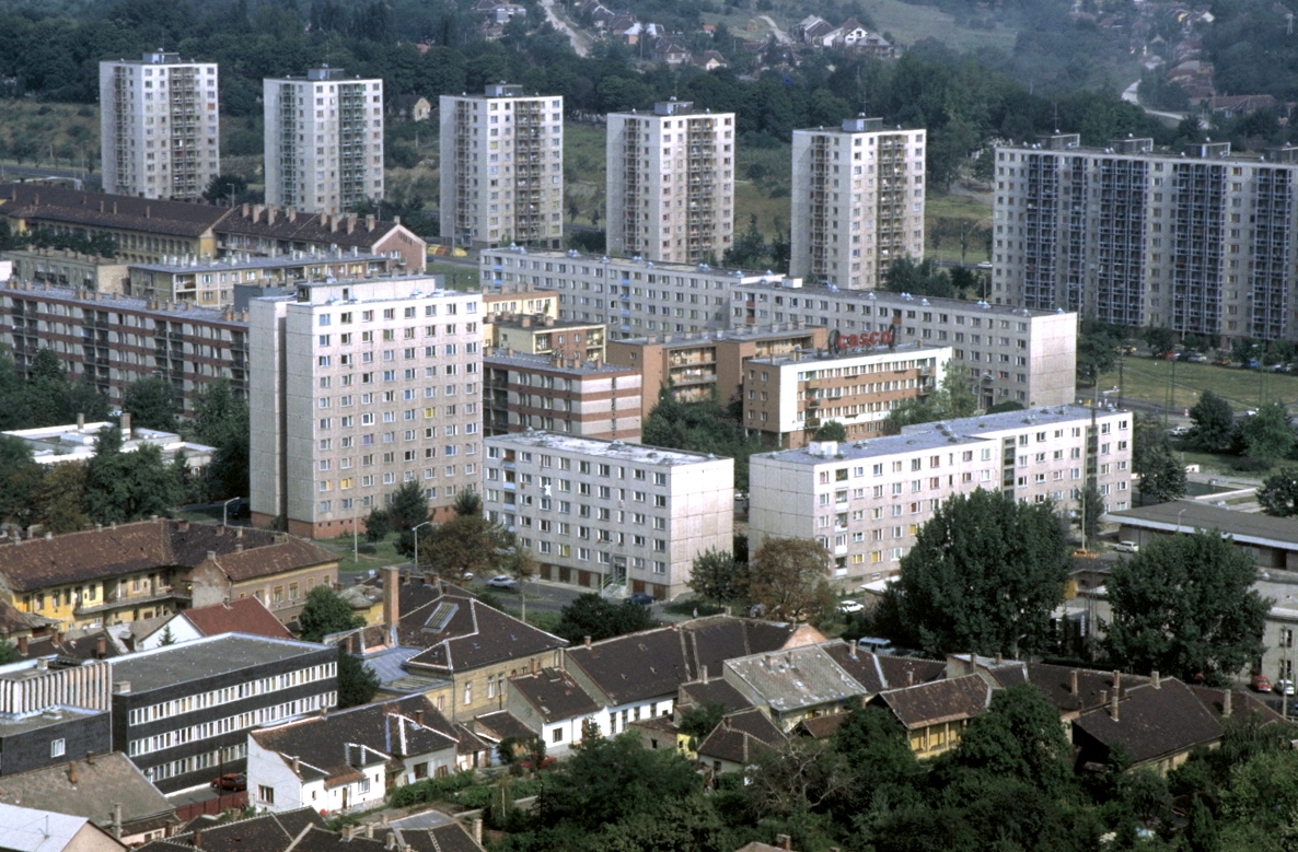 Before we left Miskolc, we stopped for a while on Avas, an elevated volcanic hill on the southern outskirts of the city that is Miskolc’s highest point.  In addition to a lovely panorama over Miskolc, the area provided one of the clearest, and newest, examples I had seen of socialist urban planning following the Soviet model of rayons (district centres that supply low frequency goods to residents of a fairly extensive area) and mikrorayons (local neighbourhood centres that supplied everyday needs within walking distance of high-rise blocks of flats).  Being an area of new construction, there was very little vegetation growth, so the patterns were very clear to see, especially along Szentgyörgy Road.  Despite the barren nature of the new development, the grey concrete structures actually bordered on looking quite attractive in the morning light.