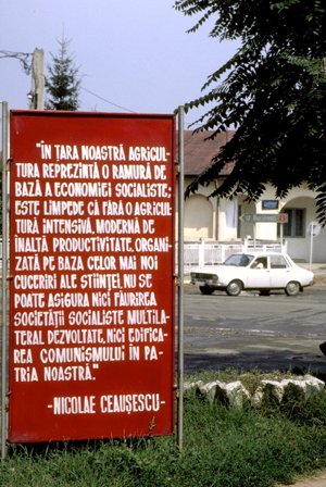 We continued south along Highway 5, making just one more stop at a small farming town on the flat plain 17 kilometres south of Bucharest called 30 Decembrie (meaning 30th December, named after the date in 1947 when the Romanian monarchy was overthrown and Romania become a republic – interestingly in 1996, the town was re-named 1 Decembrie after the date in 1918 when the Kingdom of Romania was united with Transylvania). The reason we stopped was to photograph a typical tractor-drawn trailer-bus and a few representative examples of the typical propaganda signs we had seen so often during our drive through Romania. The translation of the two signs posted on this page are: