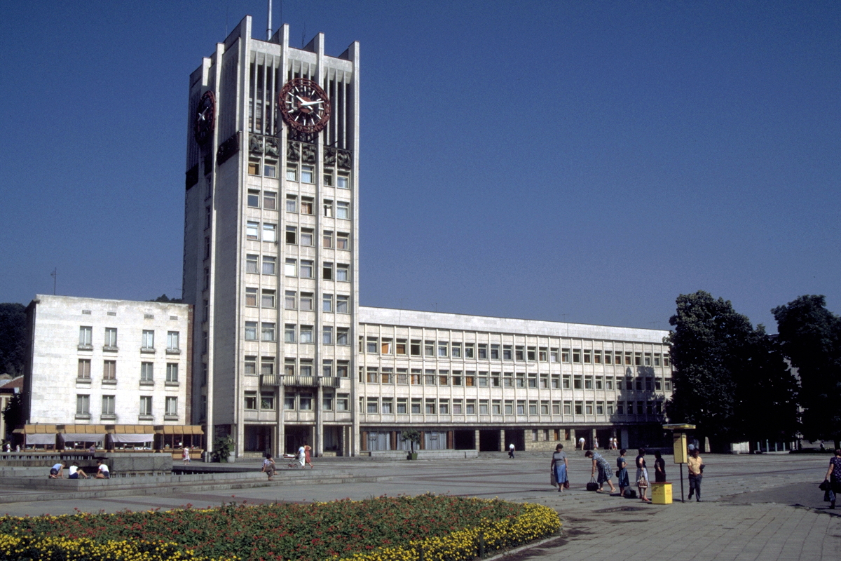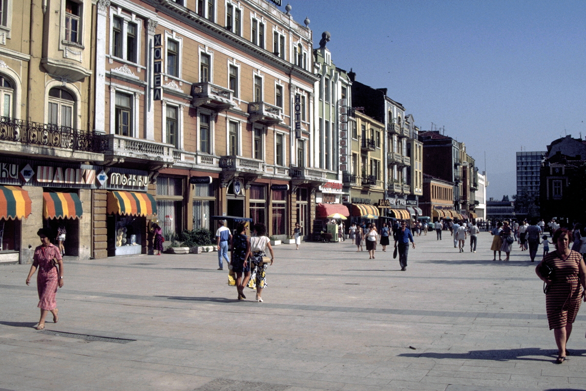 Finally, with the aid of our bad map and knowing we must be close, I parked and went off on foot to explore while Di stayed with the children and the car.  That walking trek proved to be successful – it turned out that our hotel (the Hotel Bulgaria) was located on a pedestrian plaza (Vasil Kolarov Street) and was thus inaccessible by car.  Our room, on the corner of Vasil Kolarov Street (later to be re-named Knyaz Alexander II Street) and Patriarch Evtimiy Street, had a lovely view across the pedestrian plaza to the fountains of Stefan Stambolov Square with Plovdiv City Hall behind.