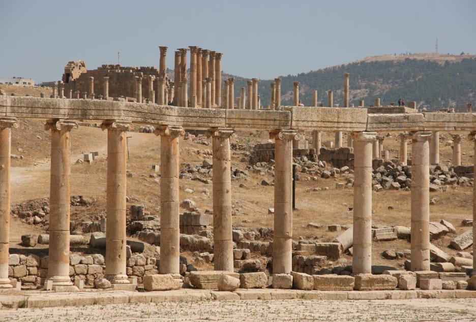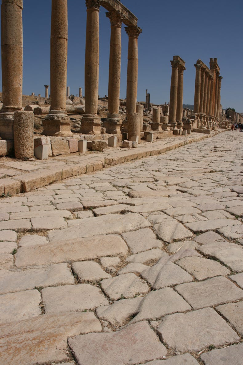 The reason for the trip to Jerash is that at the heart of the town there is a large area of beautifully preserved Roman ruins. This part of Jordan became part of the Roman Empire in 64 BC when the General Pompey conquered the region in that year. Most of the structures in Jerash were built in the period 125 AD to 165 AD.