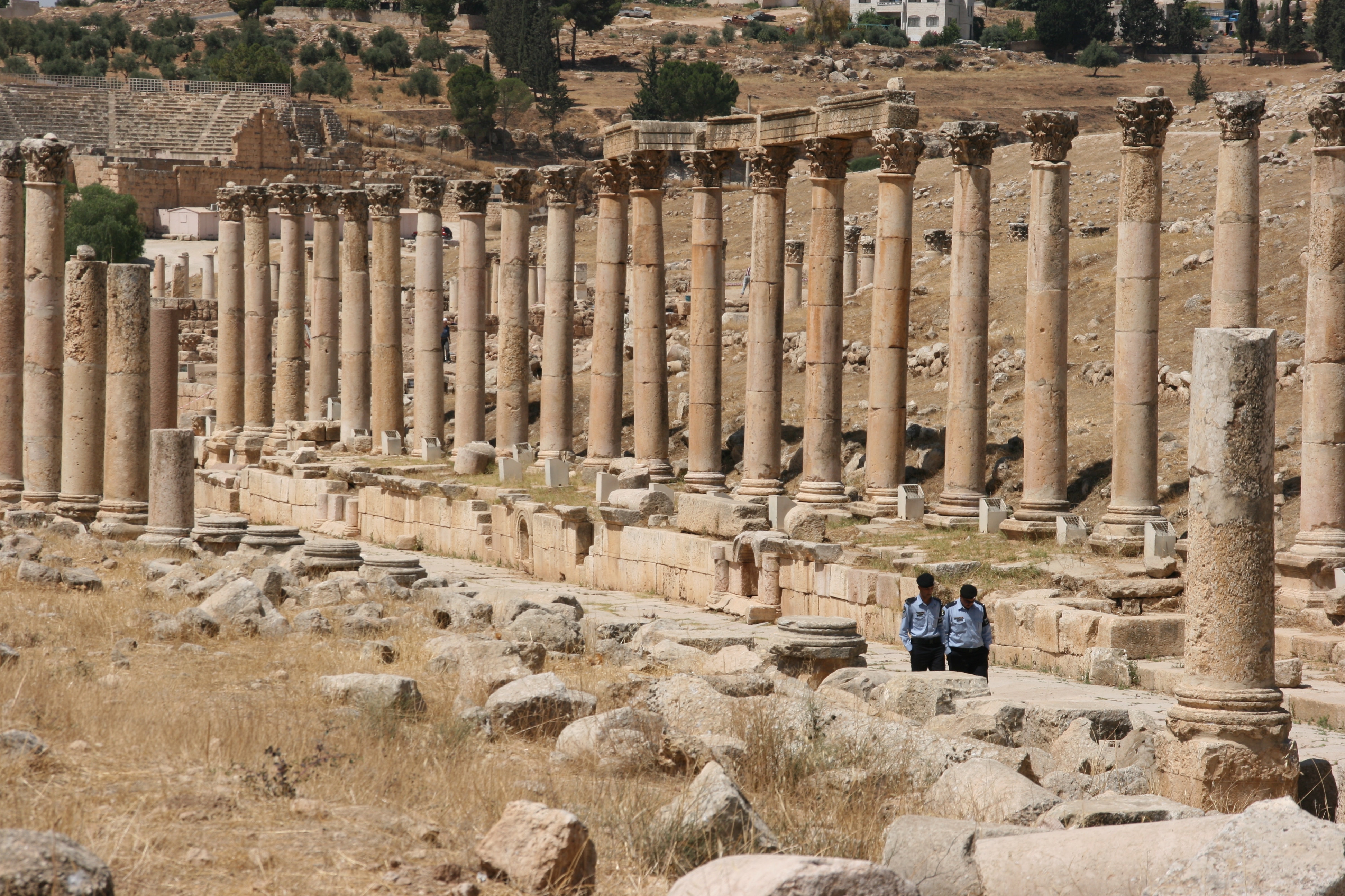 Our first destination for today was Jerash, a small city with about 160,000 people situated just over 50 kilometres from Amman. To get there we took a short taxi ride to the Northern Bus Station from which we caught a minibus to Jerash; remarkable value at just under US$1. I would like to say that I enjoyed the scenery on the trip, but an elderly men who was also on the bus wanted to engage me in conversation, so I spent most of my time looking at him rather than the scenery. He was a Muslim electrician, and he brilliantly exemplified the gentle, warm, tolerant attitude that most Jordanians have towards visitors.