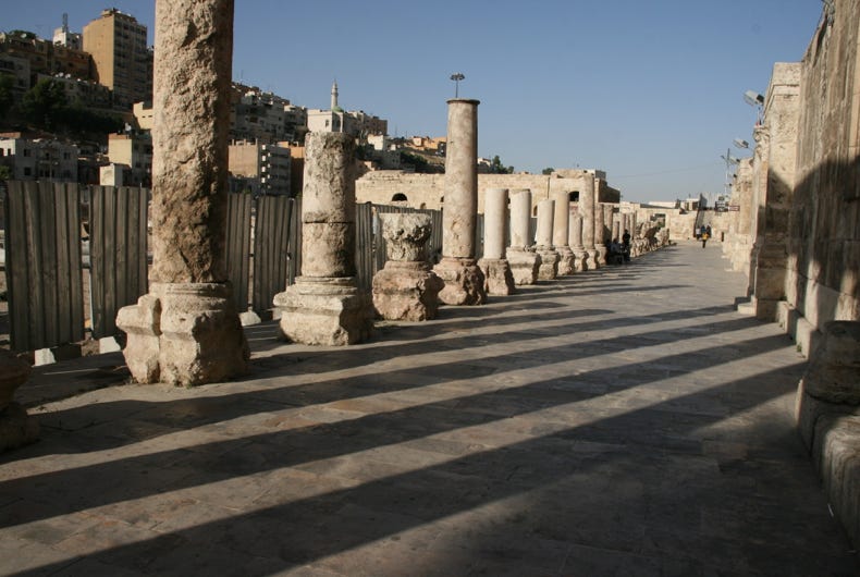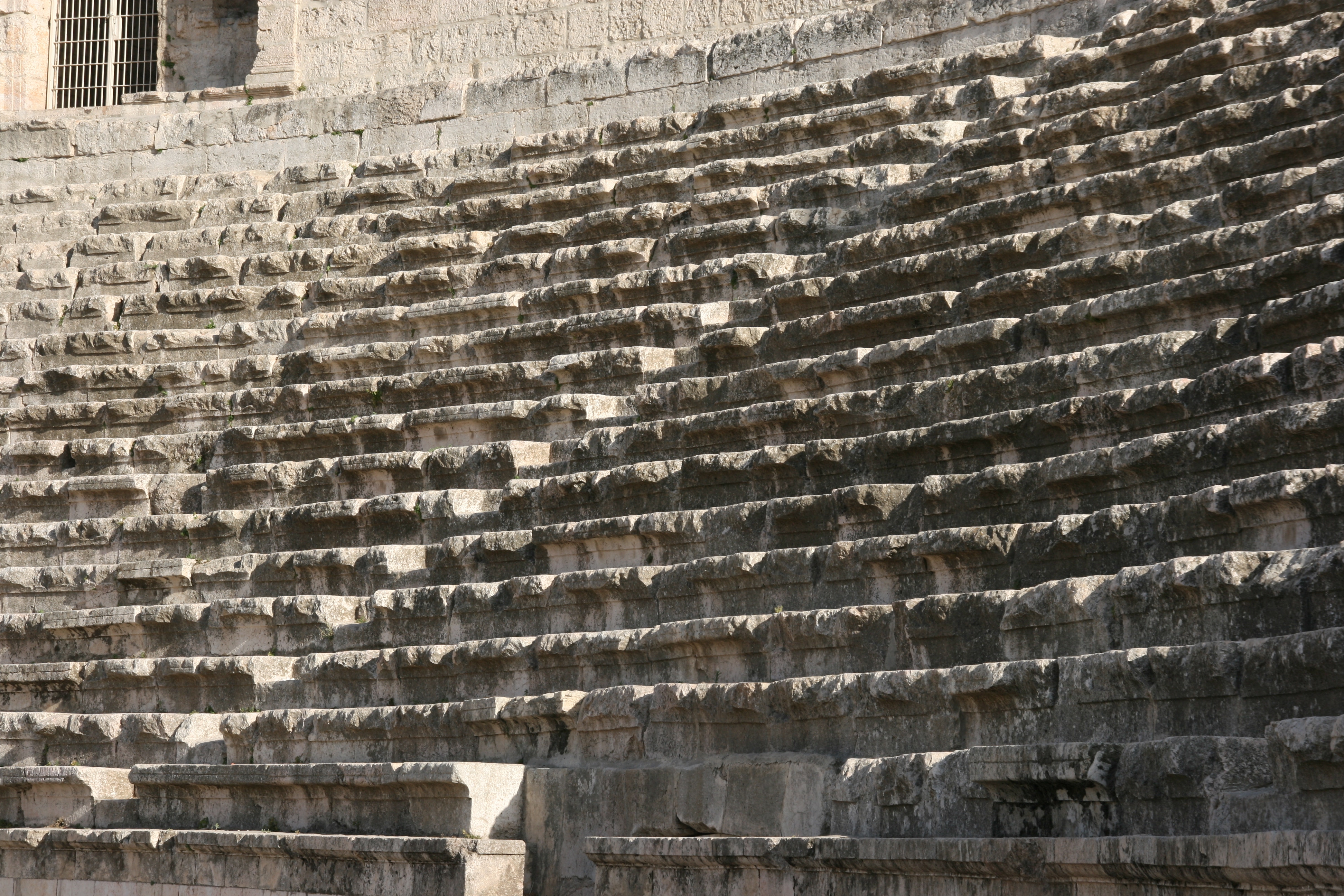 Immediately in front of the Theatre was a row of columns, the sole remains of what was once one of the largest public squares in the Roman Empire, the 100 by 50 metre Forum. We arrived at the Roman Theatre just 15 minutes before closing time (which was 6 pm), but it was enough time to explore the Theatre and then enjoy the late afternoon shadows cast by the Forum’s remaining pillars.
