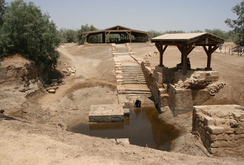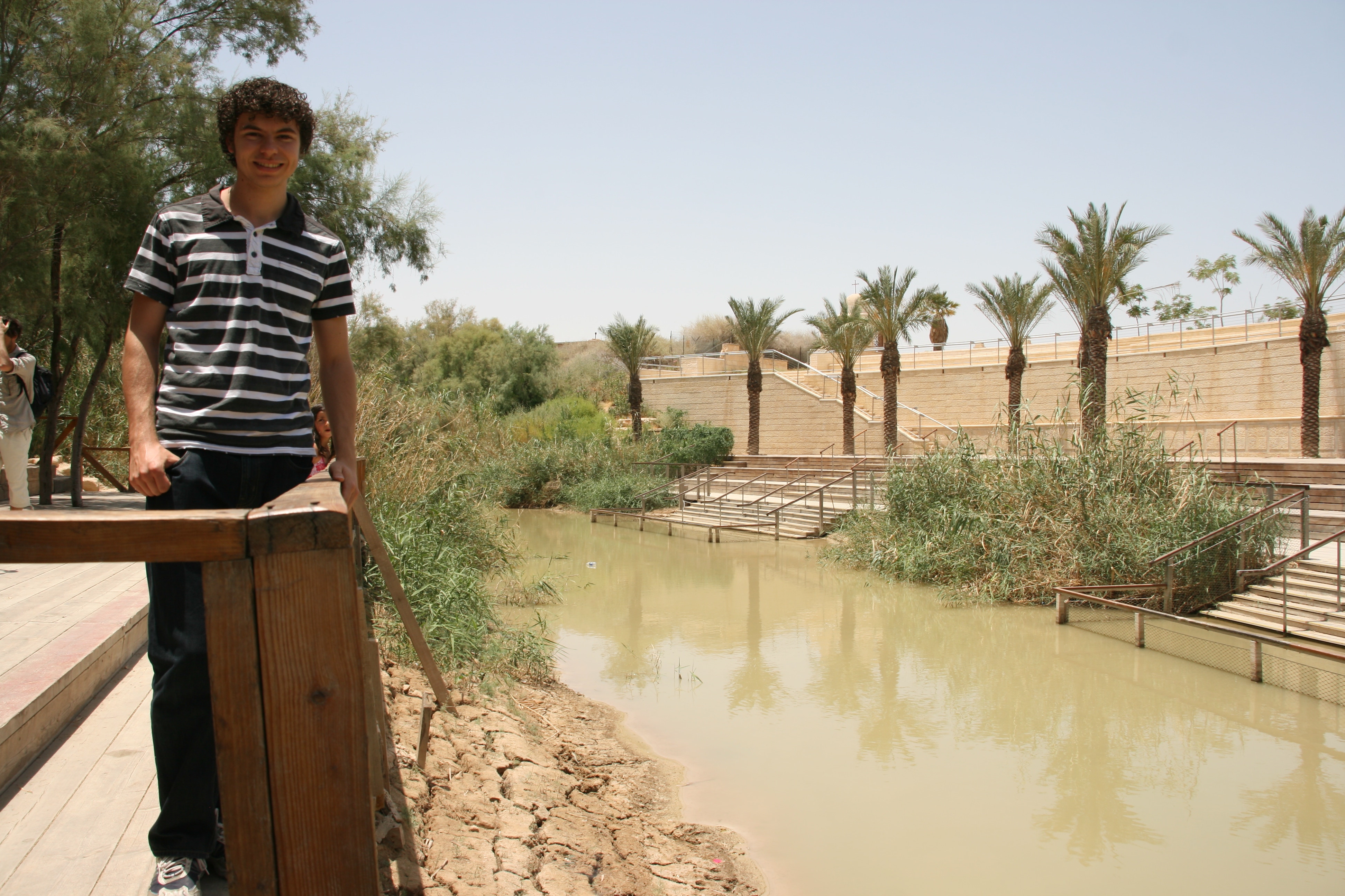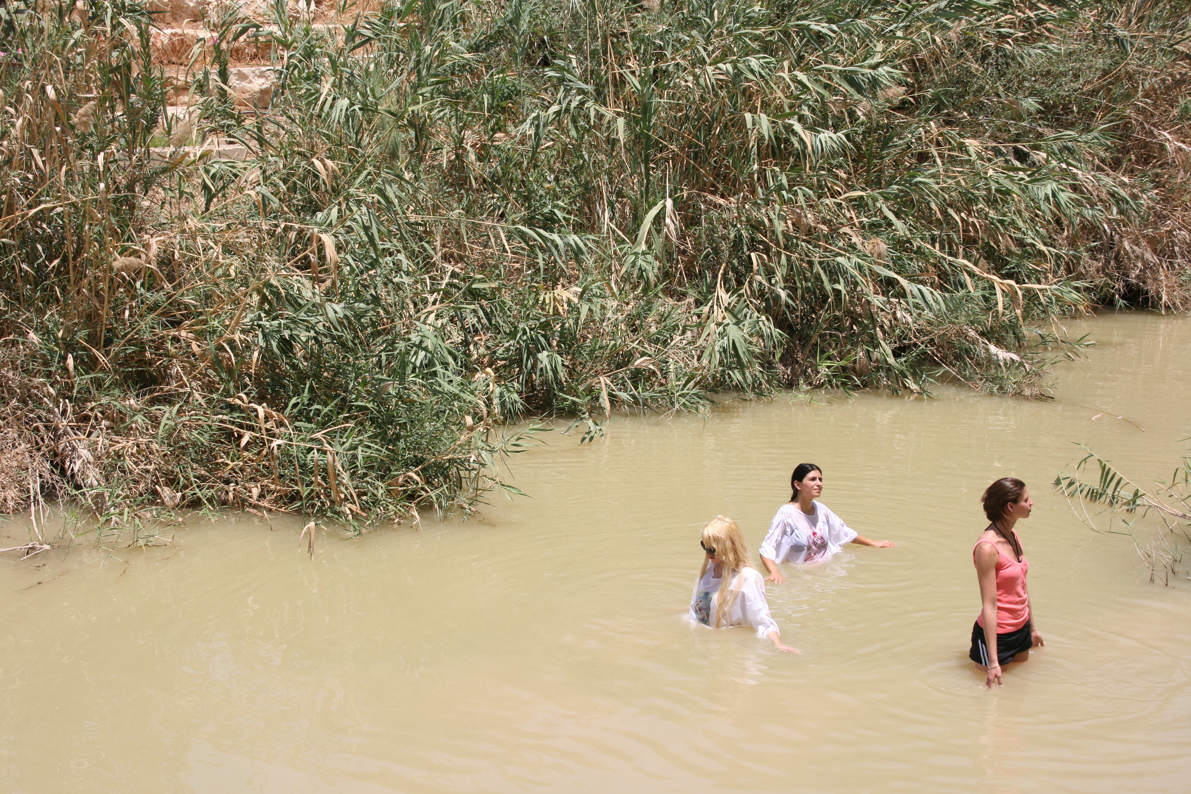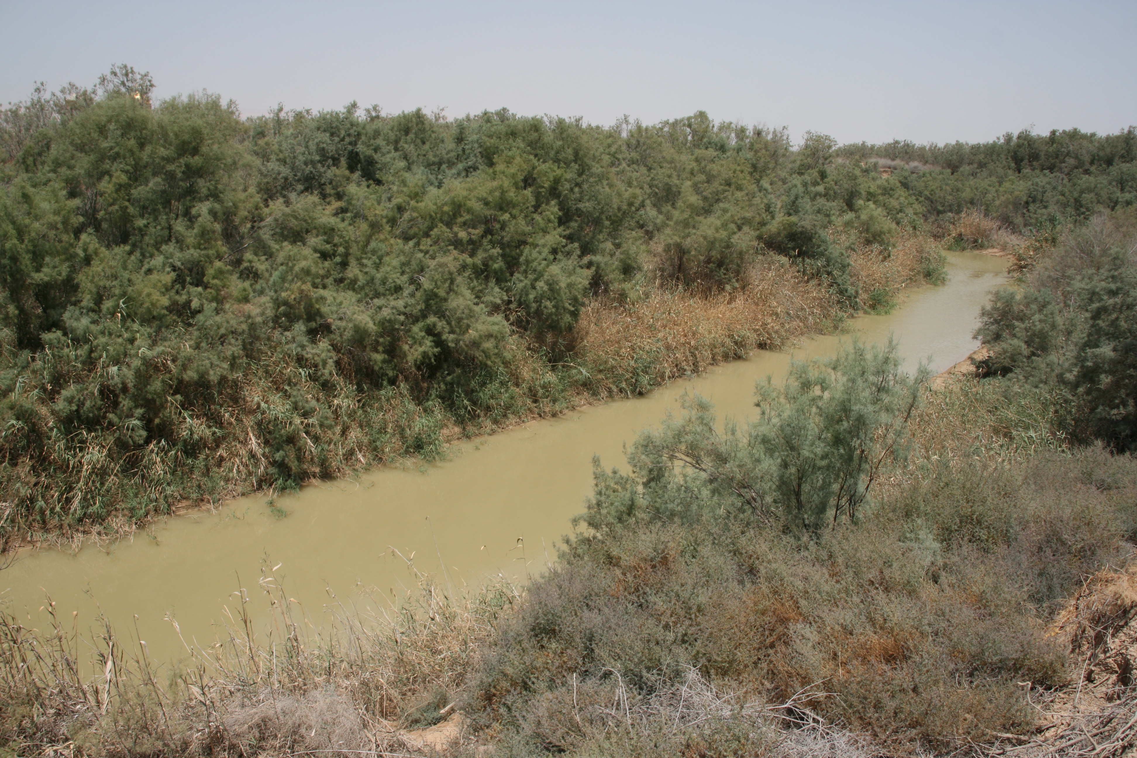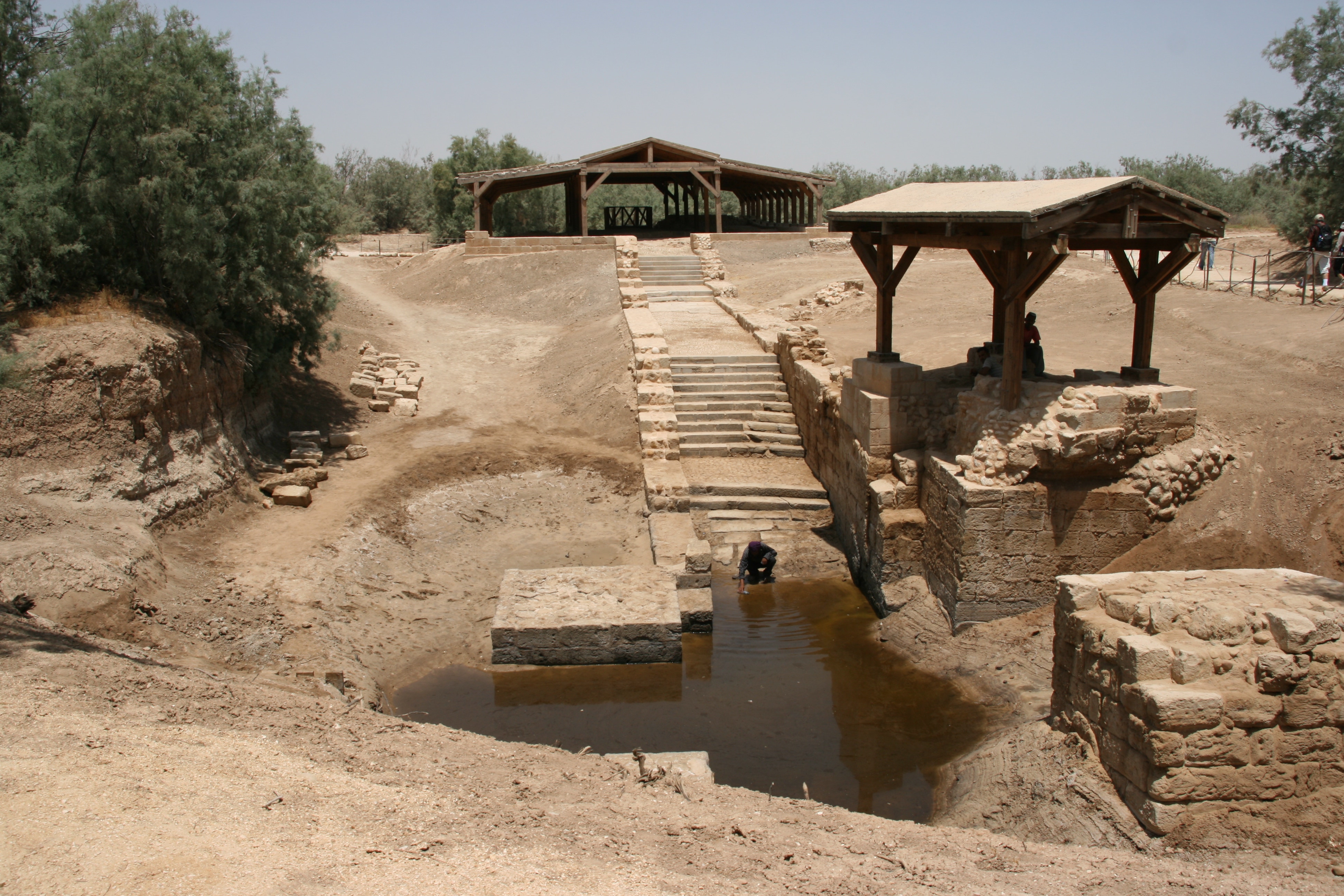 The photo at the top of today’s page shows the actual site of Jesus’ baptism; the shelter in the background is protecting some ancient mosaics that formed the floor of a very early Byzantine Christian church that was built on the site. When Jesus was baptised, there was, of course, much more water flowing in the river than today, and the water hole in the photo was part of the flowing river. Today, most of the water is taken for irrigation upstream by the Israelis, leaving just a trickle to flow along the course of the river and into the Dead Sea.