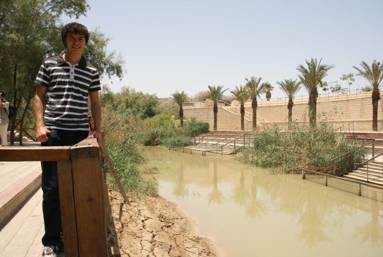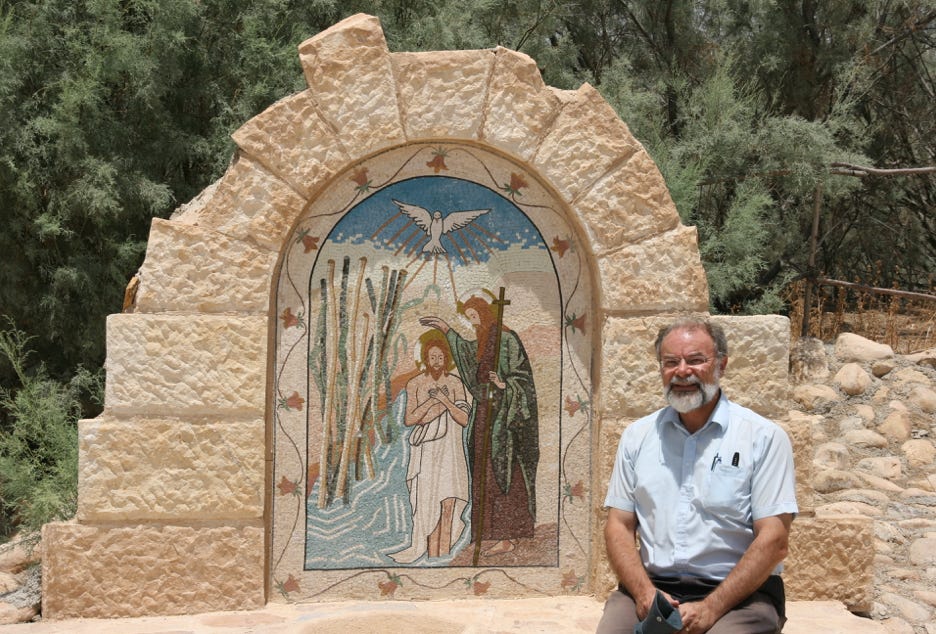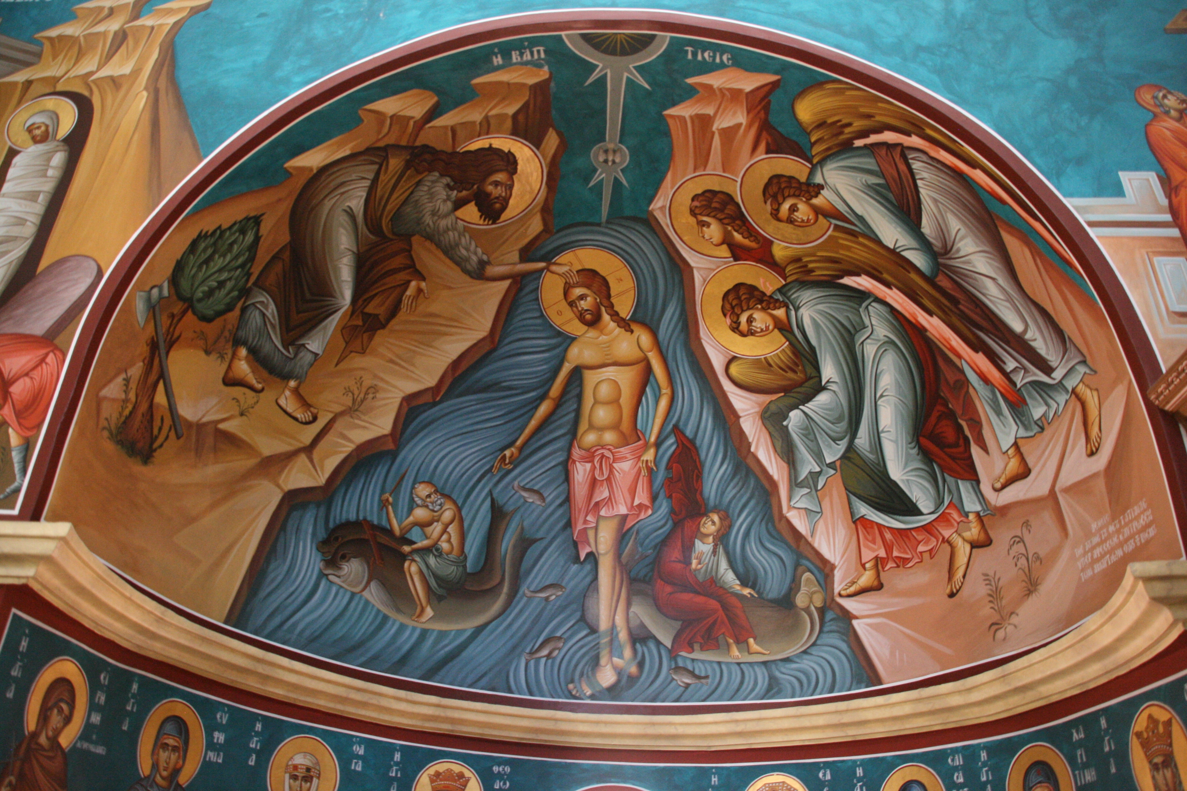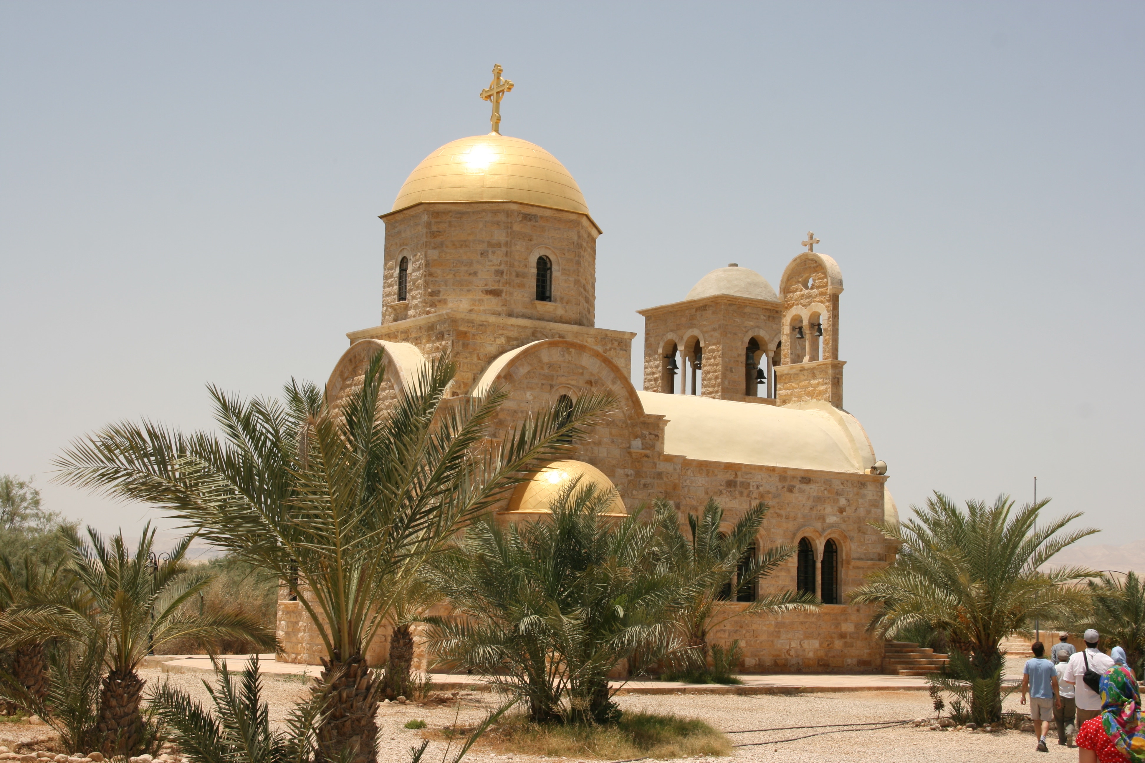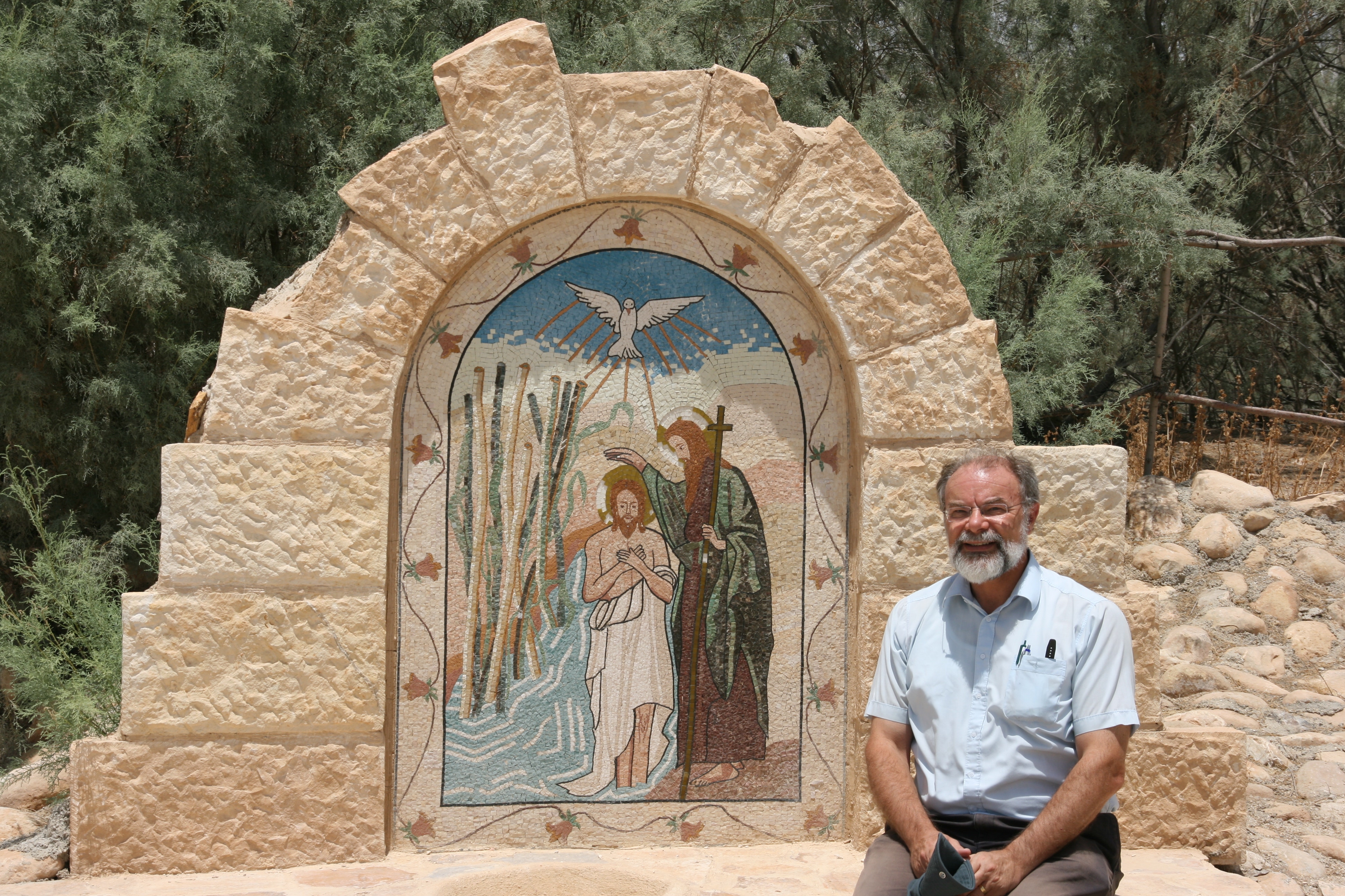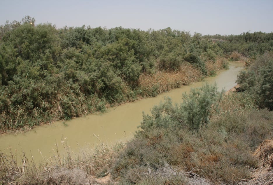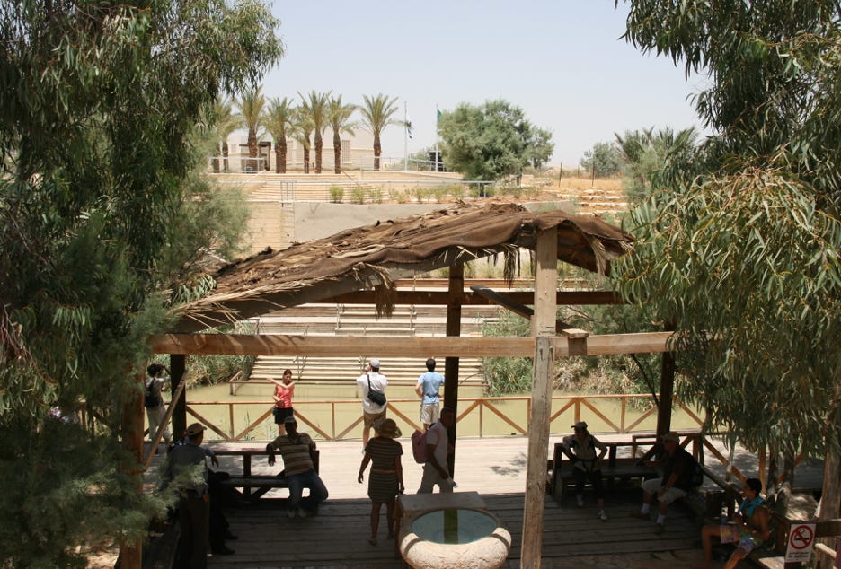 The photo at the top of today’s page shows the actual site of Jesus’ baptism; the shelter in the background is protecting some ancient mosaics that formed the floor of a very early Byzantine Christian church that was built on the site. When Jesus was baptised, there was, of course, much more water flowing in the river than today, and the water hole in the photo was part of the flowing river. Today, most of the water is taken for irrigation upstream by the Israelis, leaving just a trickle to flow along the course of the river and into the Dead Sea.