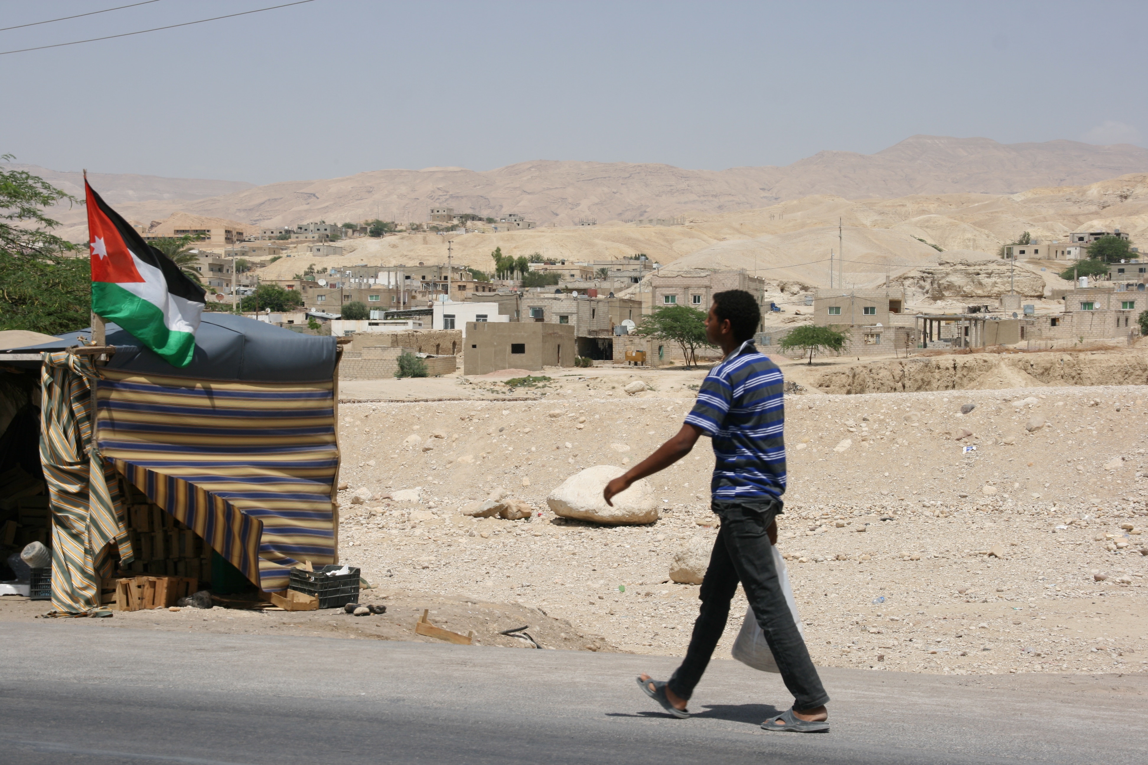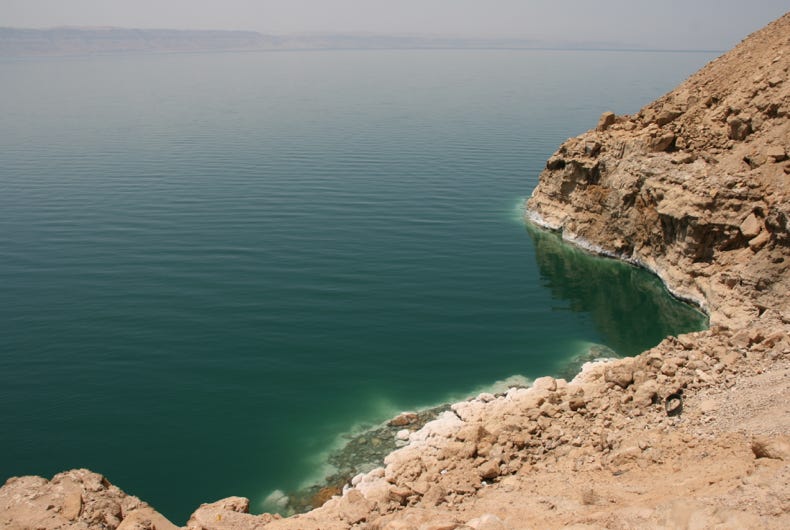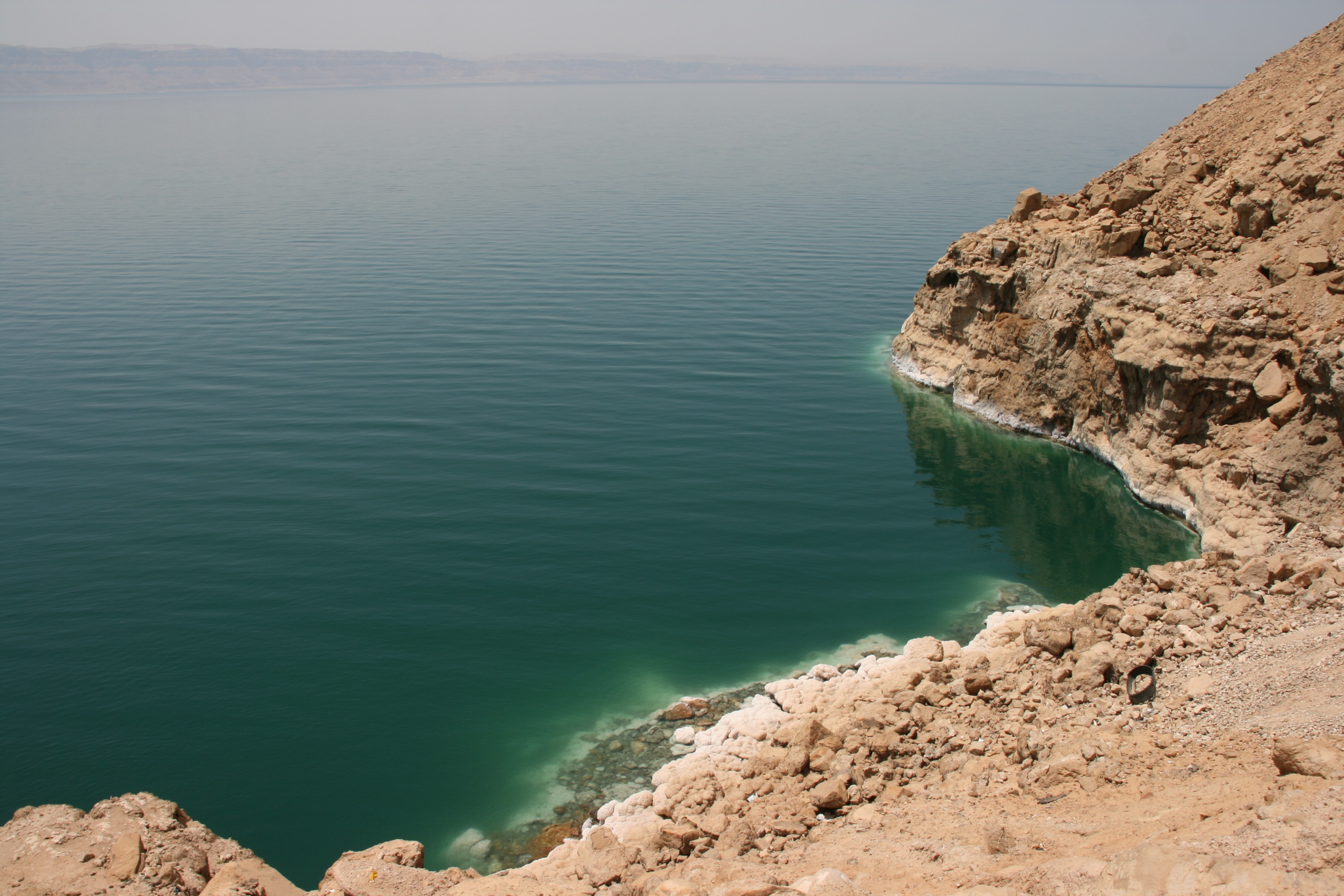 Following the visit to Bethany-Beyond-the-Jordan, we drove south along the eastern edge of the Dead Sea. This was, I am sure, the lowest I have ever been in altitude, as the area is about 400 metres below sea level. Andrew would have loved to go for a swim in the Dead Sea as he had heard you can stay afloat while making zero effort (this seemed to appeal to him!), but we agreed that the cost was prohibitive, both at the several resorts (which charged US$60 per person to access their beaches) and at the beaches used by local people (which charged US$35 per person to enter their enclosures). We did, however, stop at a few places to admire the blue colour of the water and the sparkling white encrustations of salt along the shorelines.