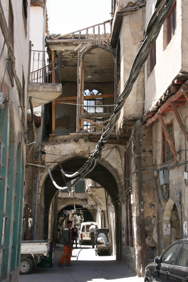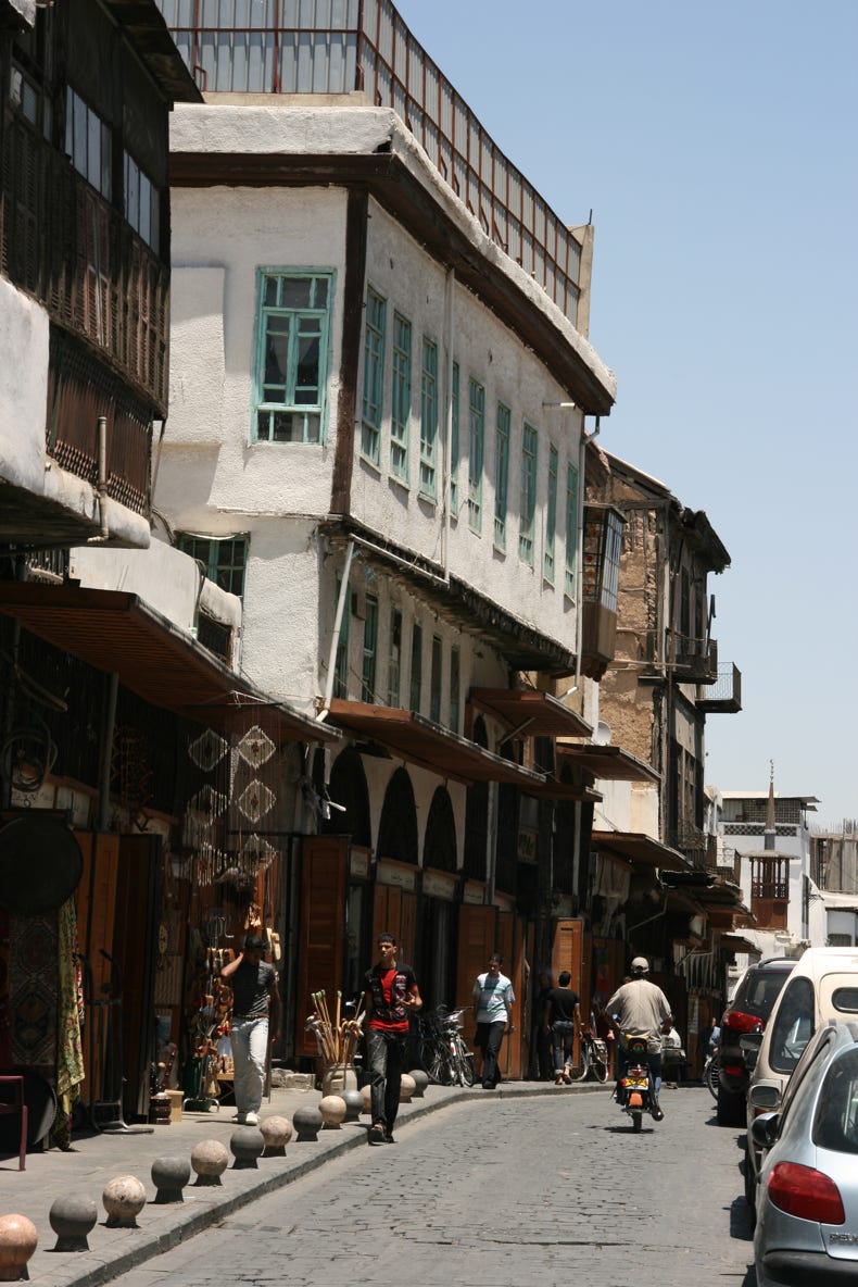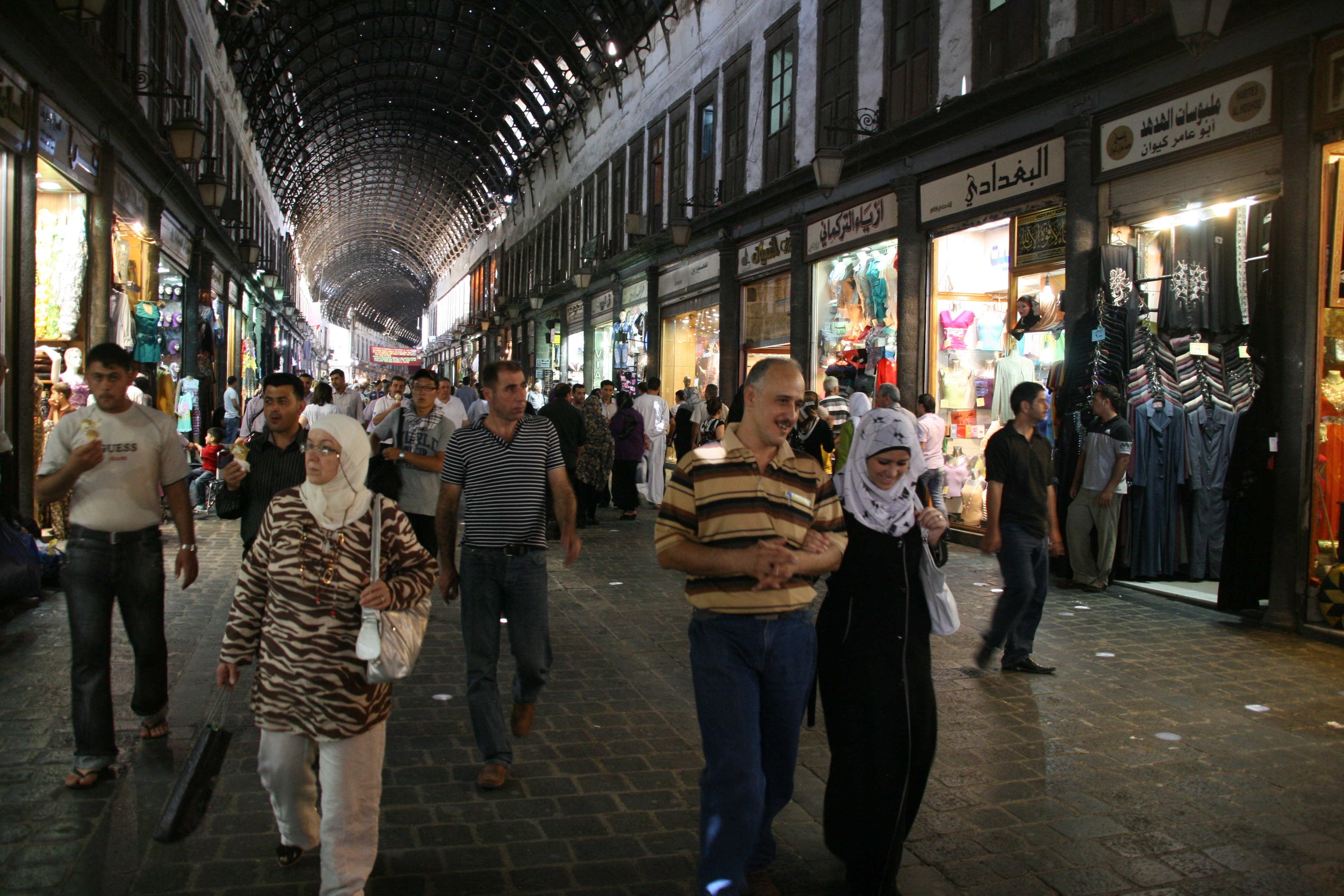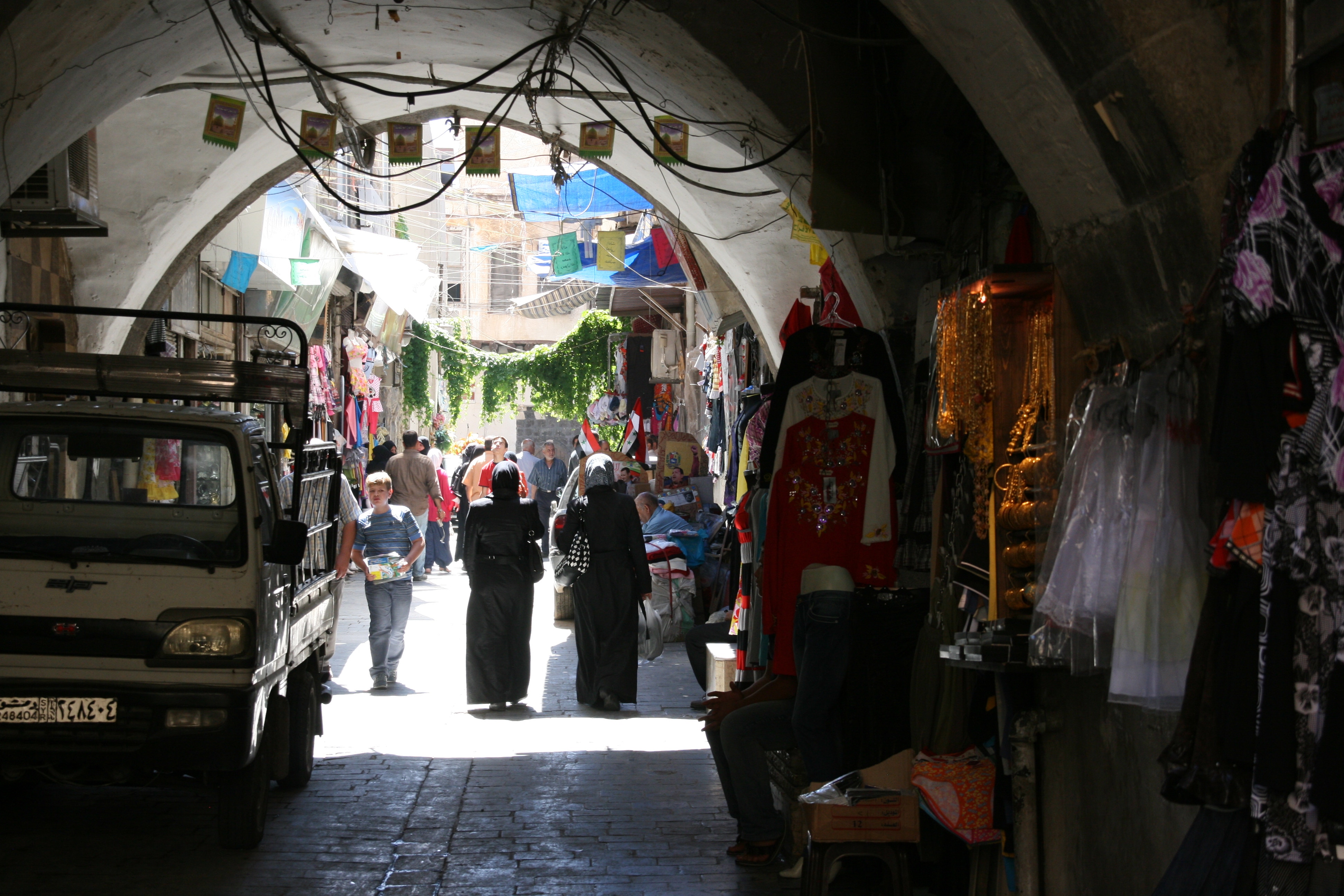 Finally, at a little after midday, we set out to explore our one and only destination for the day, the old walled city centre of Damascus. The entrance to the walled city was just 10 minutes walk from our hotel, and we were soon enveloped in a high, cavernous arcade of shops that formed the western entrance to the Old City, a market area known as the Souq al-Hamidyya. The arcade was constructed in the late 1800s, and the corrugated metal roof is still peppered with small bullet holes made by machine gun fire from French planes in 1925 when a nationalist rebellion was quelled.