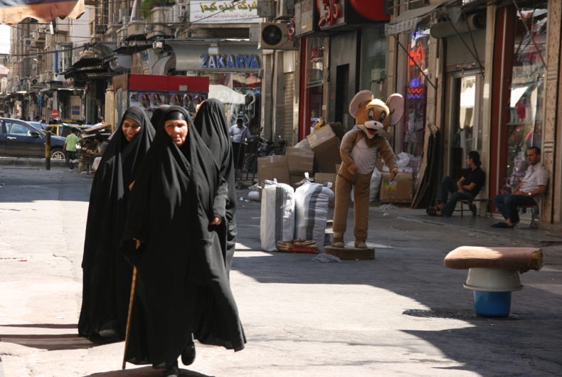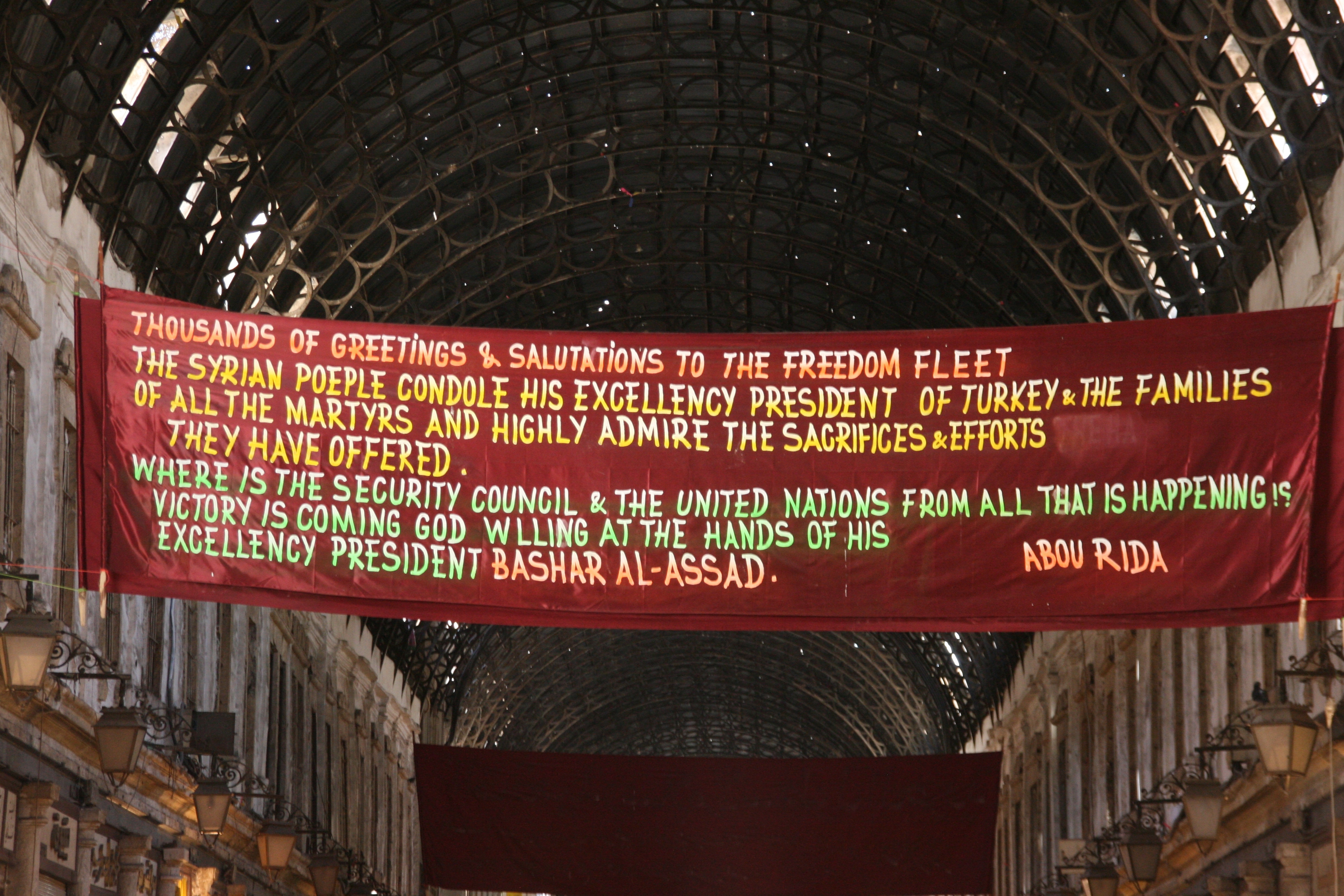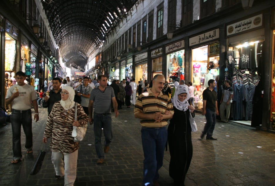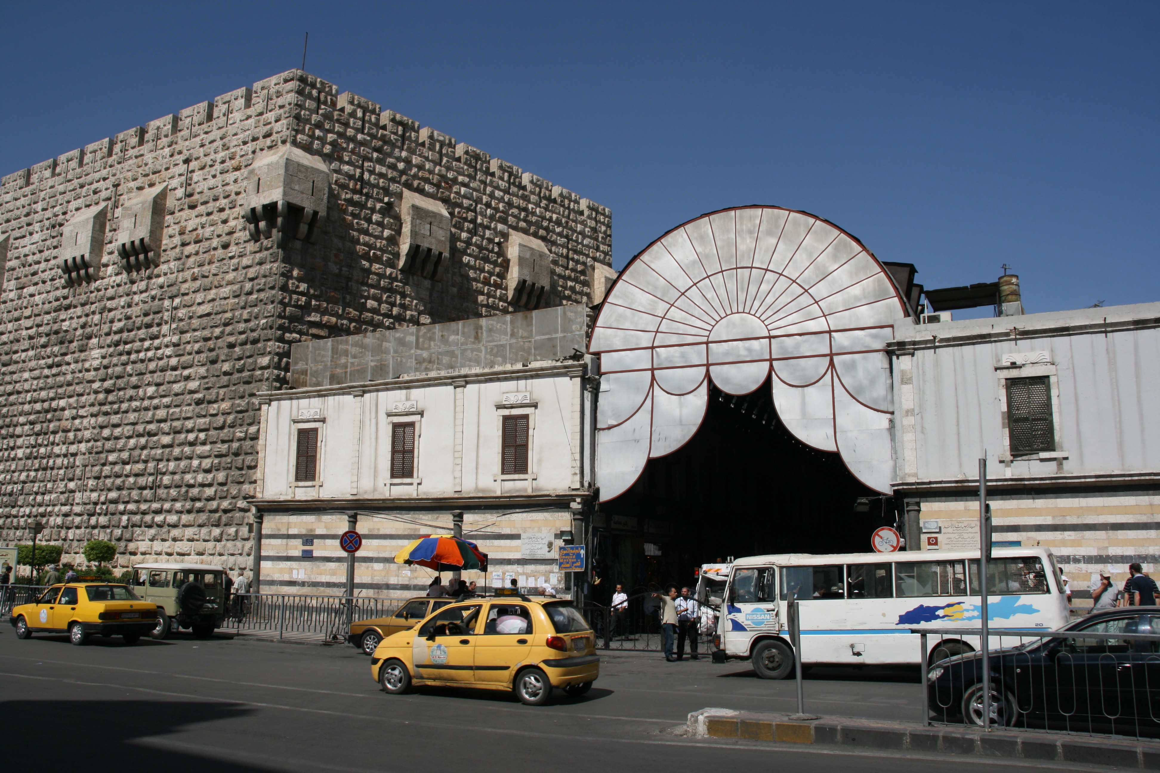 Finally, at a little after midday, we set out to explore our one and only destination for the day, the old walled city centre of Damascus. The entrance to the walled city was just 10 minutes walk from our hotel, and we were soon enveloped in a high, cavernous arcade of shops that formed the western entrance to the Old City, a market area known as the Souq al-Hamidyya. The arcade was constructed in the late 1800s, and the corrugated metal roof is still peppered with small bullet holes made by machine gun fire from French planes in 1925 when a nationalist rebellion was quelled.