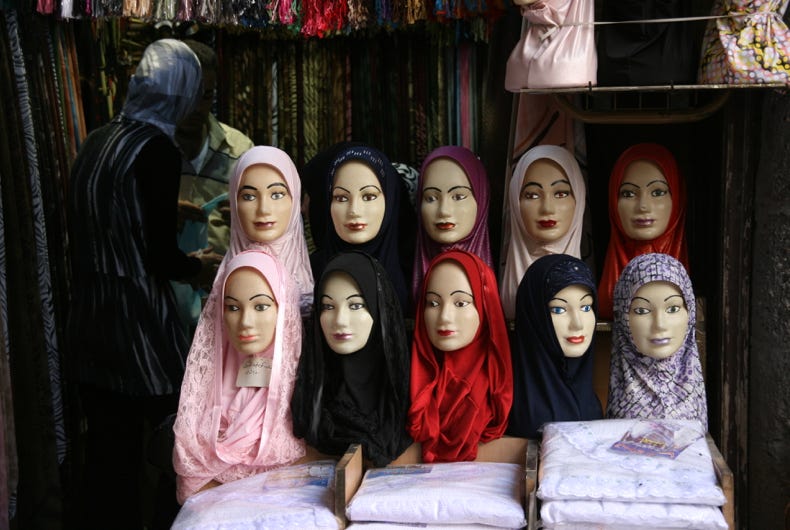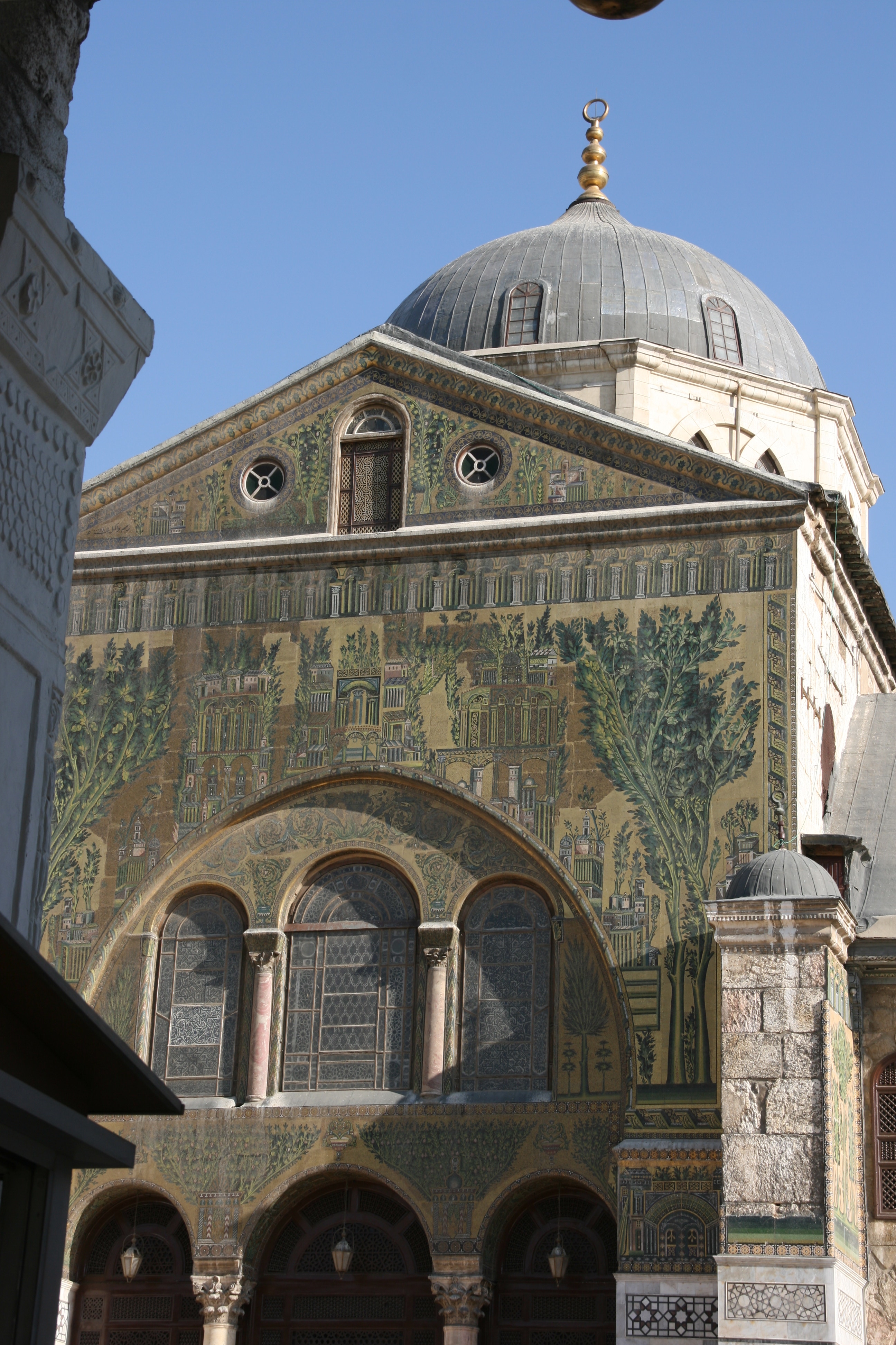 In one of the interior photos, the women’s area can be seen to the left of the row of pillars. In another interior photo, the green domed structure is the mosque’s most important shrine, a shrine to John the Baptist (known to Muslims as the Prophet Yehia). It is claimed that the shrine contains the severed head of John the Baptist. The mosque contains the tombs of several other significant people, including Hussein, the son of Ali and grandson of the Prophet Mohammed.