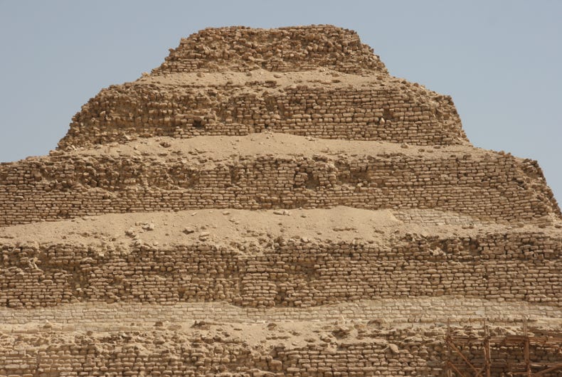 The central sight at Saqqara was the Step Pyramid of Zoser, which was built in about 2625BC, making it the world’s oldest stone monument and the first pyramid. However, this was just one feature in a 7 square kilometre area of pyramids, tombs and temples.