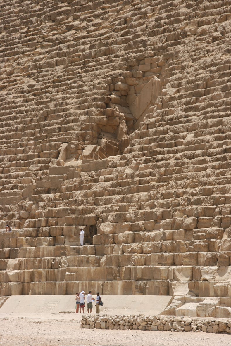 The huge pyramids at Giza (three large one for pharaohs, plus six smaller ones for wives) are between 100 and 200 years younger than those at Saqqara. Their scale, however, is almost an order of magnitude greater. For example, the Great Pyramid of Khufu (also known as Cheops) was 146 metres high when it was first built, although the removal of the outer layer of limestone and subsequent erosion has reduced the height to 138 metres. Nonetheless, the pyramid remained the tallest structure of the world for 3,800 years (until the spire of Lincoln Cathedral was built in the 1300s).