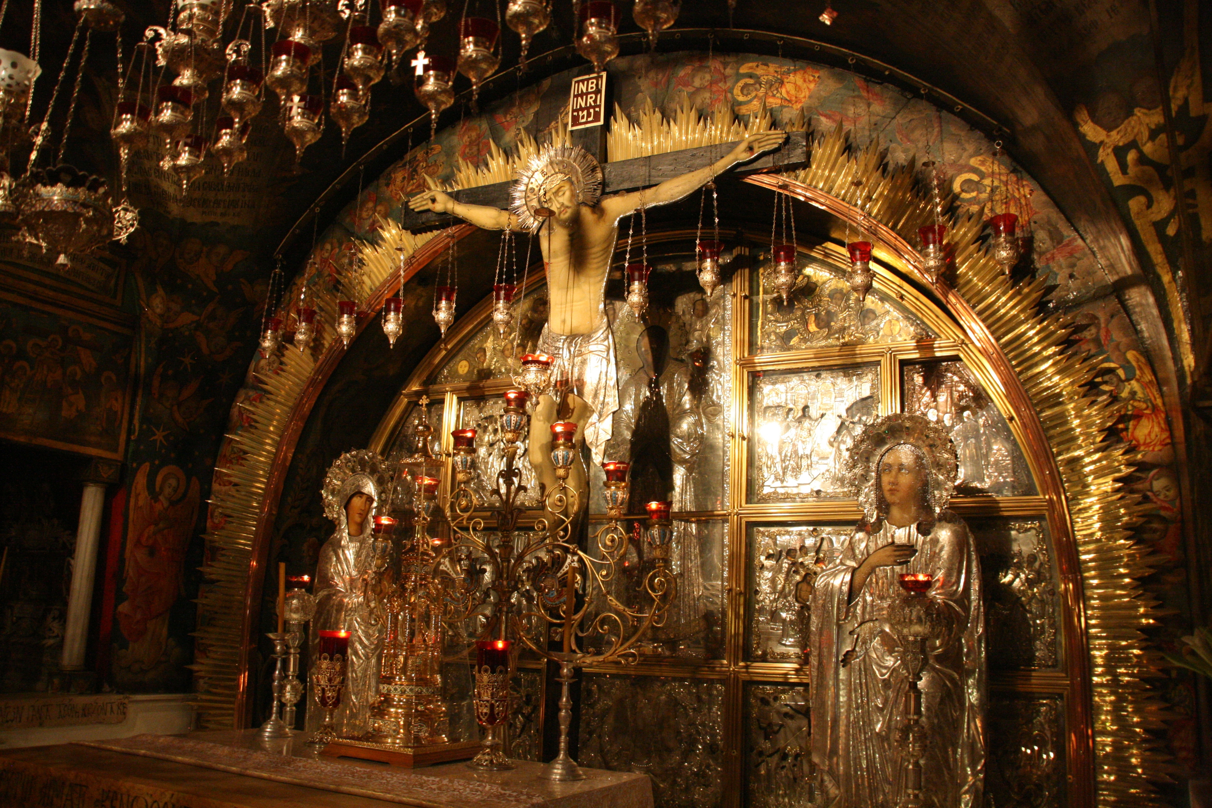 Archeological work during the 3rd century appears to to have confirmed the location, which at the time was still outside the city walls. A flight of stairs just inside the main entrance leads to an upper gallery where parts of the rocky summit of the hill can still be seen (through glass) on either side of an iconic (in the very literal sense of iconic = ‘lots of icons’) altar where the crucifixion is believed to have taken place.