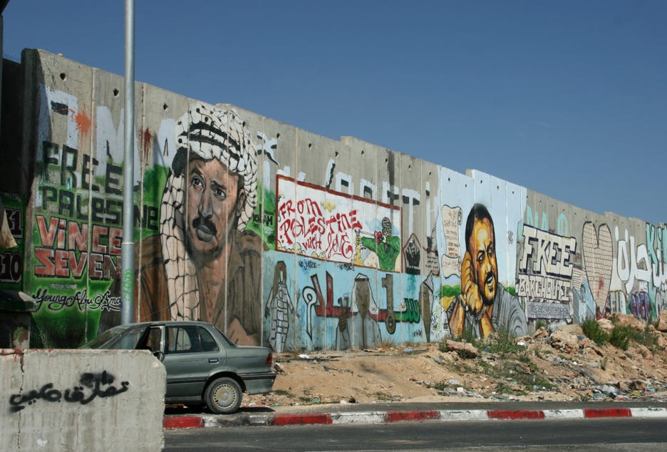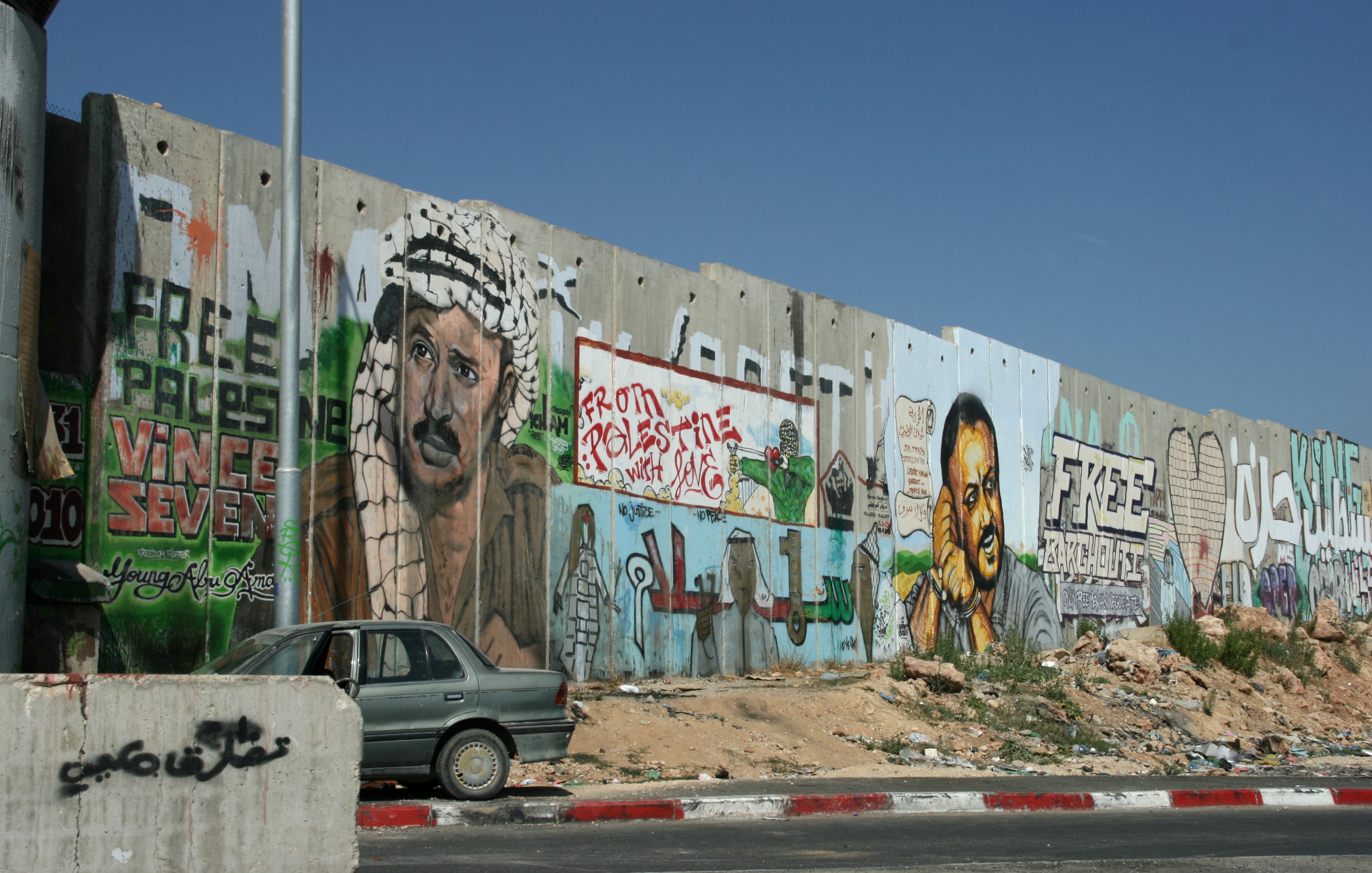 The area that is under the jurisdiction of the Palestinian Authority is defined by a large, and growing, security wall erected by the Israelis. It has been labelled the “Iron Wall”, the “Apartheid Wall” and the “New Berlin Wall” by Palestinians, but according to the Israeli government, it is officially “a separation barrier”. Construction of the “fence” (for want of a neutral term!) began in 2002, and it is still continuing. Roughly twice as high as the (original) Berlin Wall, the “fence” extends for some 650 kilometres.