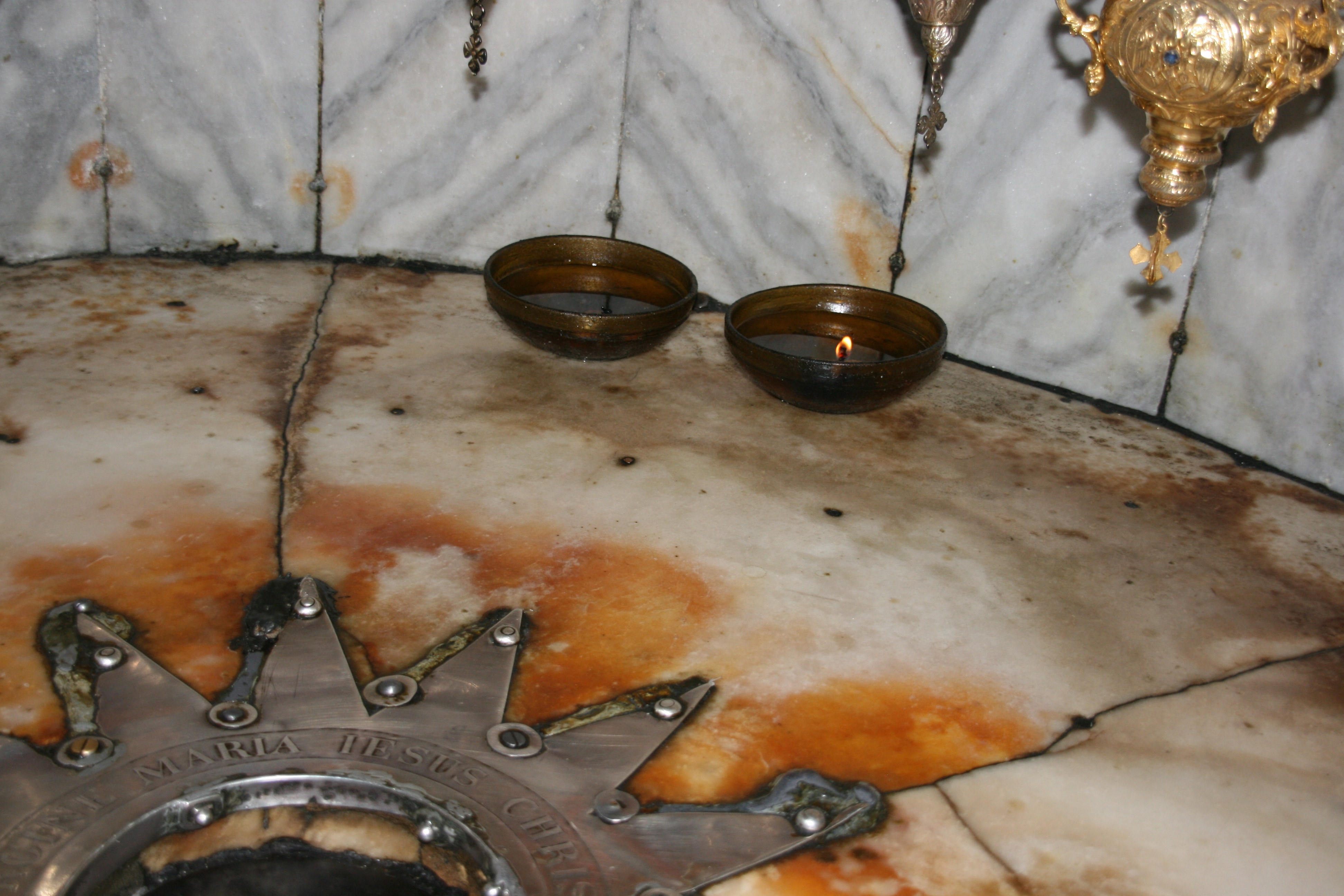 The grotto is very small, with room (just) for only two people at the time to kneel before it. The place where Jesus was born is marked by a 14-point metal star surrounding a sheet of glass beneath which is the rock-hewn place where Jesus is believed to have been born. As Jesus is regarded as a great prophet by Muslims (though not by Jews), the people visiting included some Muslims in addition to the overwhelming majority of Christians from all parts of the world (some of whom would have created a better impression if they had taken to heart Jesus’ teachings on meekness and patience).