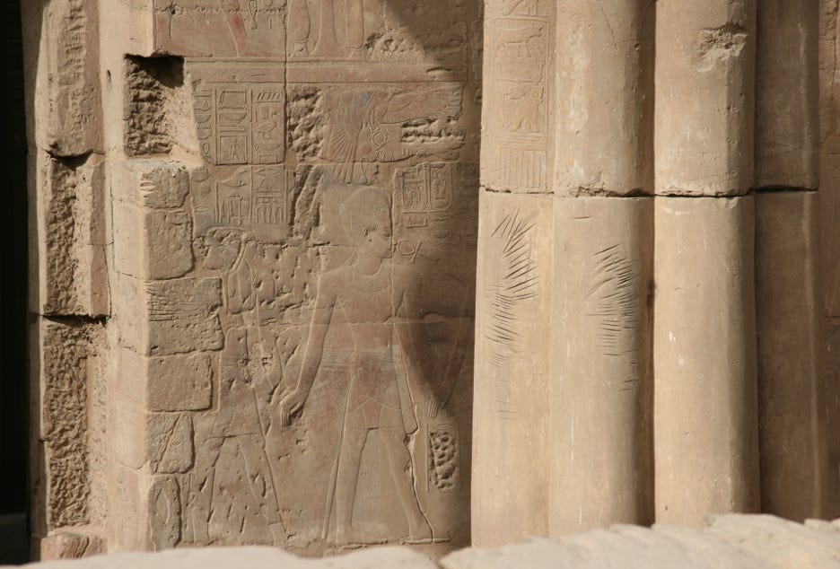 A long avenue lined by sphinx marked the main approach to the temple (see photo to the left), although everything was closed for some unknown reason today. Nonetheless, I was able to circumnavigate the entire complex on foot via a path that encircles the complex. This enabled me to see the temple from all sides, including some quite close views of the beautifully fine carvings of ancient Egyptian life on some of the walls.