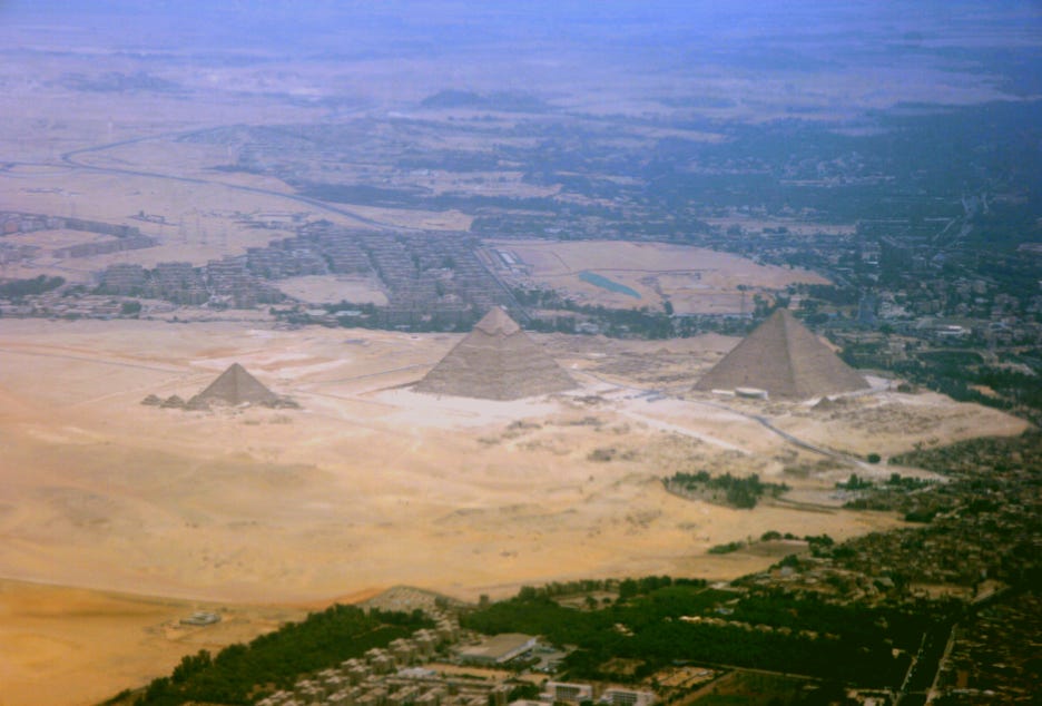 The flight took just an hour and a quarter, and without doubt the highlight was not the tiny glass of mango juice we were served as refreshment, but the views of Cairo as the plane approached the airport. Our flight did an east-west transect of the city, starting in the west by flying over the Pyramids at Giza and then crossing the Nile River above the Central Business District before descending over the crowded residential areas of the east bank. With a population of about 18 million people, Cairo is truly one of the world’s megacities, and to get a bird’s eye perspective on the density of the older parts of the city was sensational.
