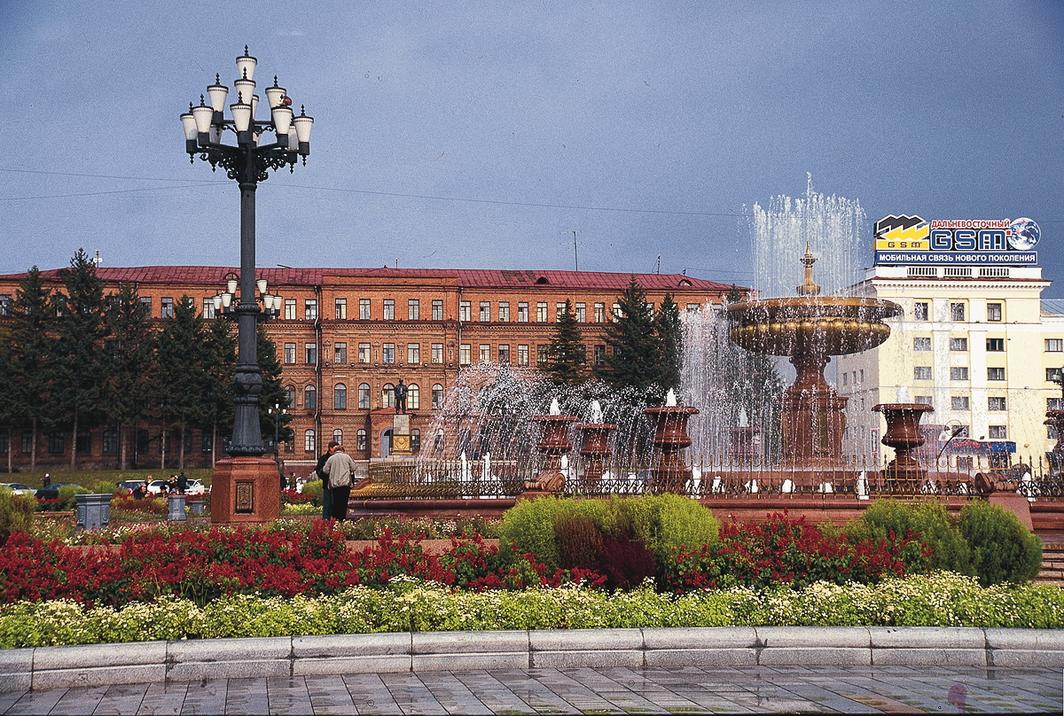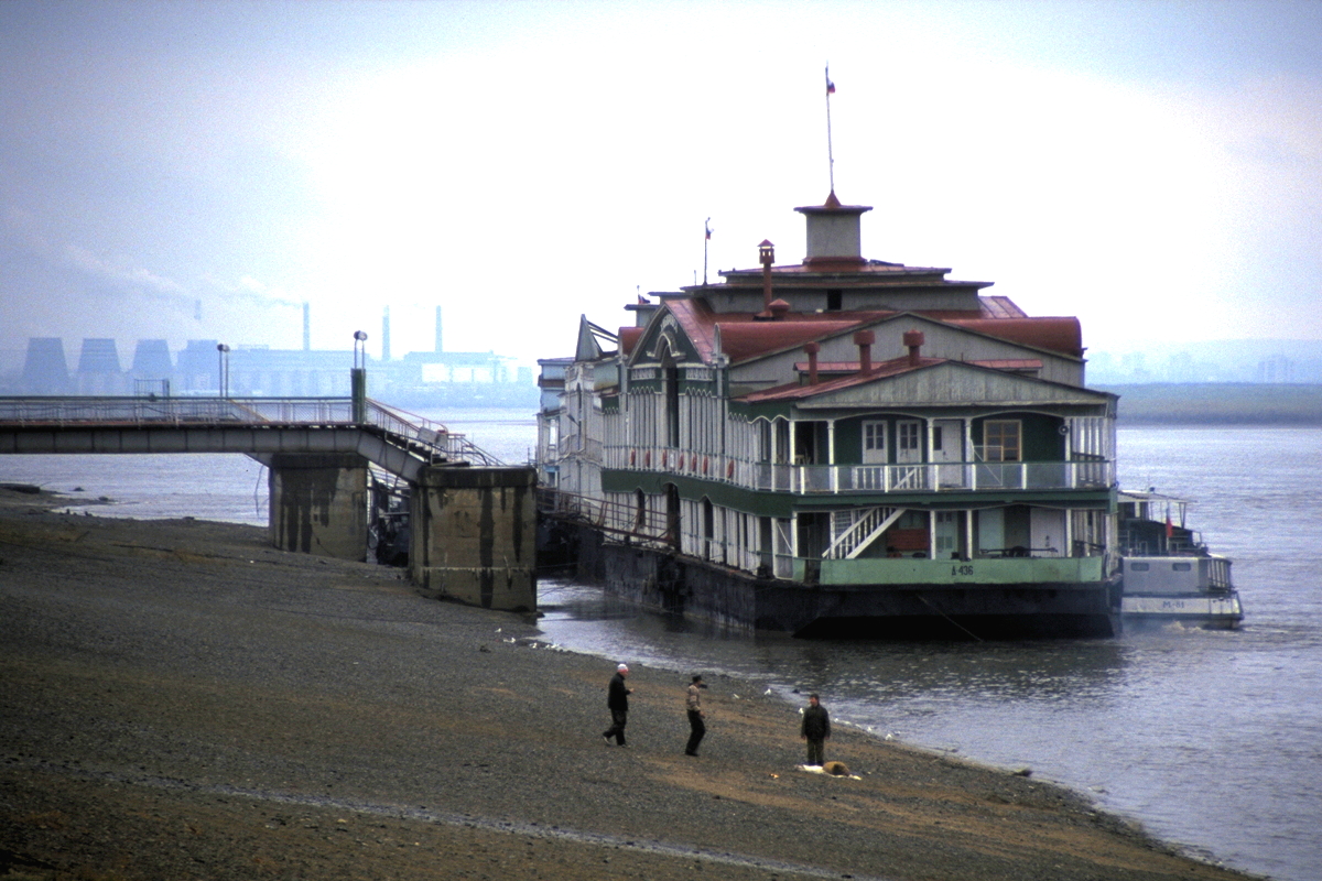 We arrived at Khabarovsk a little before 10am, and drove into the city, which is only about 15 km from the airport. Although the day was very dark with heavy overcast clouds, the city was delightful to look at. The main street begins at a huge square (called Lenin Square) with a massive fountain in the middle, a statue of Lenin to one side and the tall, somewhat featureless concrete high rise building that serves at the City Government Building. At the other end of the main street, about one and a half kilometres away, is a park with a long flight of steps leading down to the spectacularly wide Amur River. In between these ends is a wonderful array of well preserved (and well renovated) European-Russian style buildings on either side of a wide tree-lined boulevard. At the western end, nearest the river, is a beautiful Russian Orthodox church that looks newly built, bizarrely situated right beside a huge Soviet war memorial with stars, hammers and sickles etc.